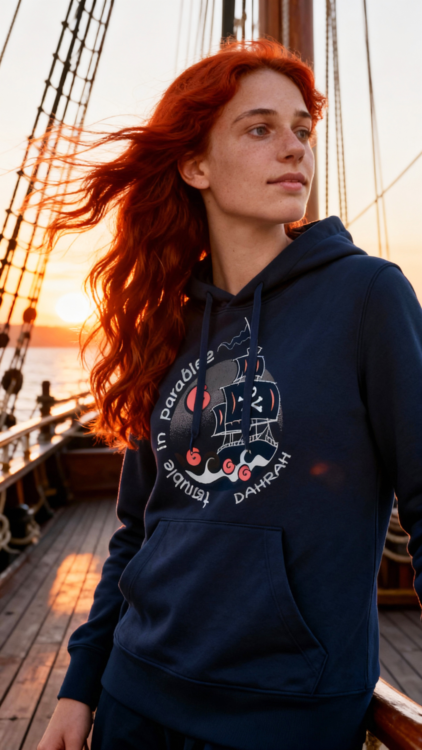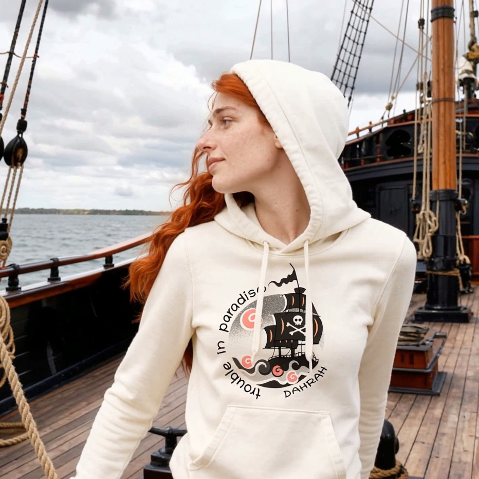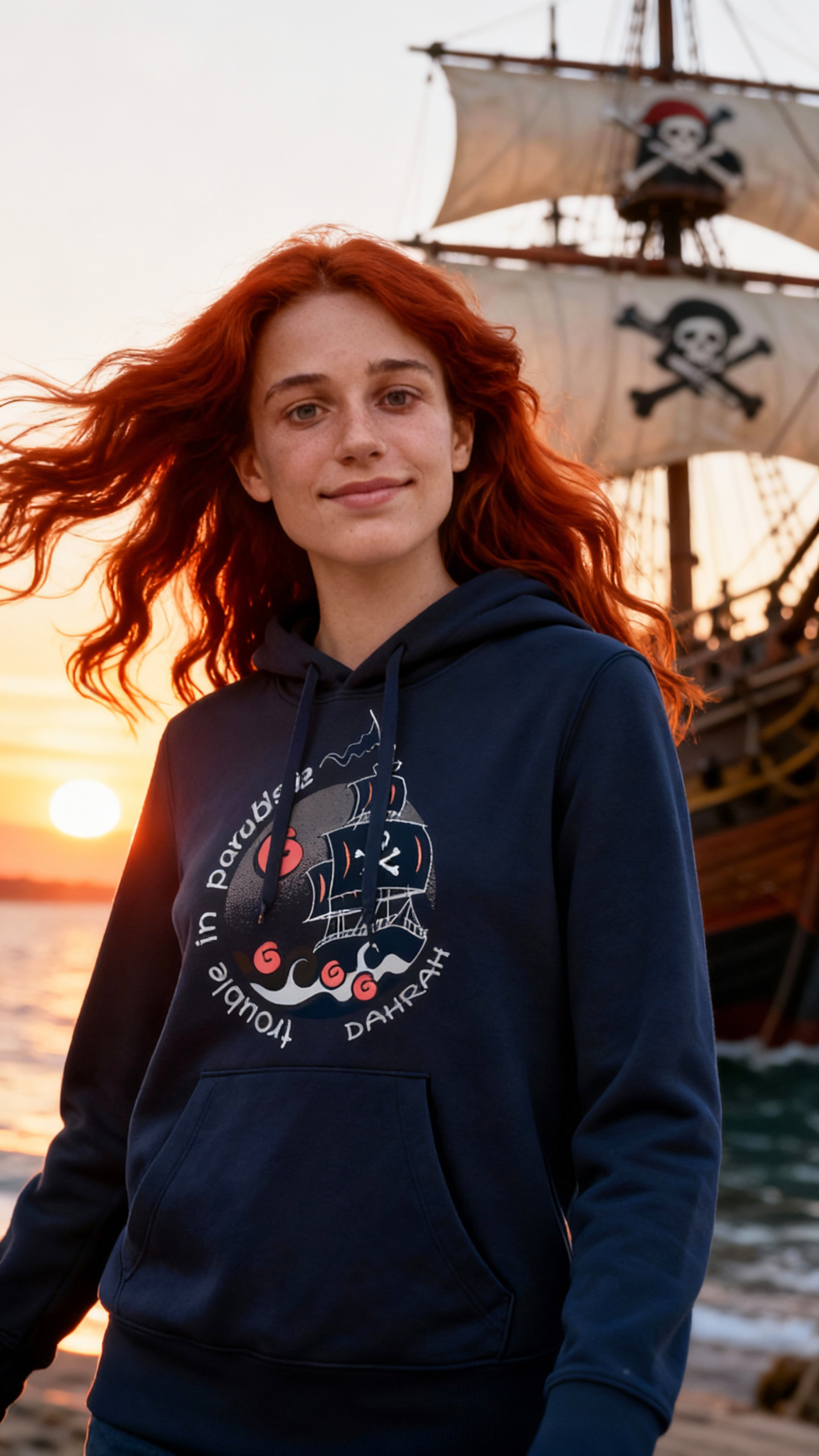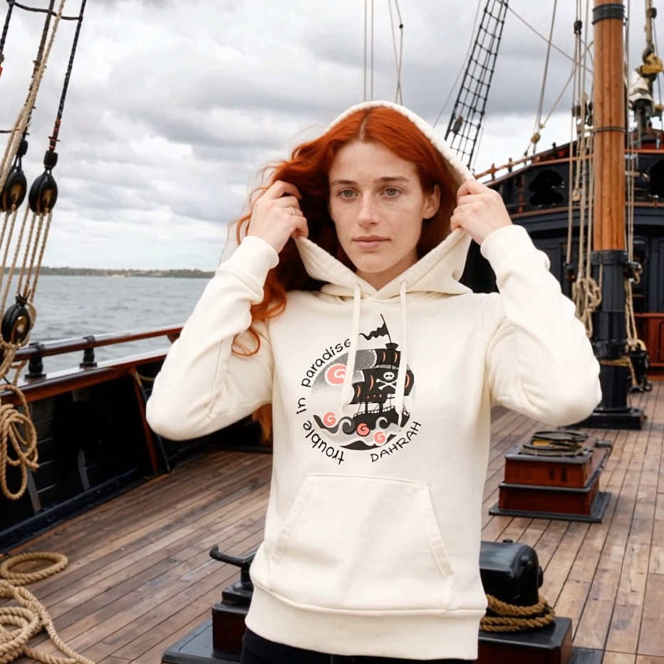 Sailing and surfing hoodie by DAHRAH with print of a pirate ship. Normal fit, for mid-season. 85% organic cotton, 15% recycled polyester, 280 GSM (gram per square meter). Vegan and OEKO-TEK certified. Click here for size advise: take a hoodie that you own which fits you well and compare the dimensions.