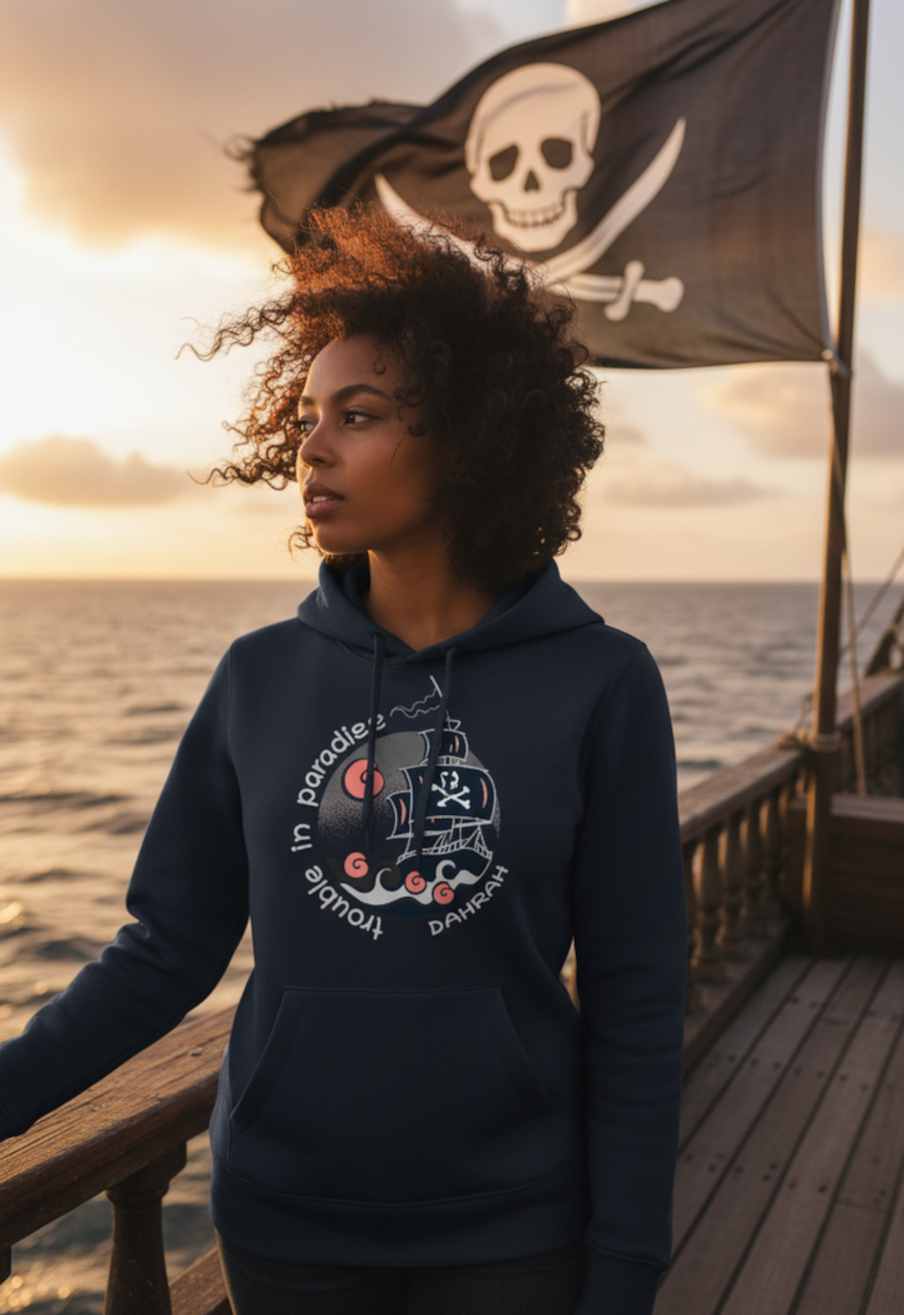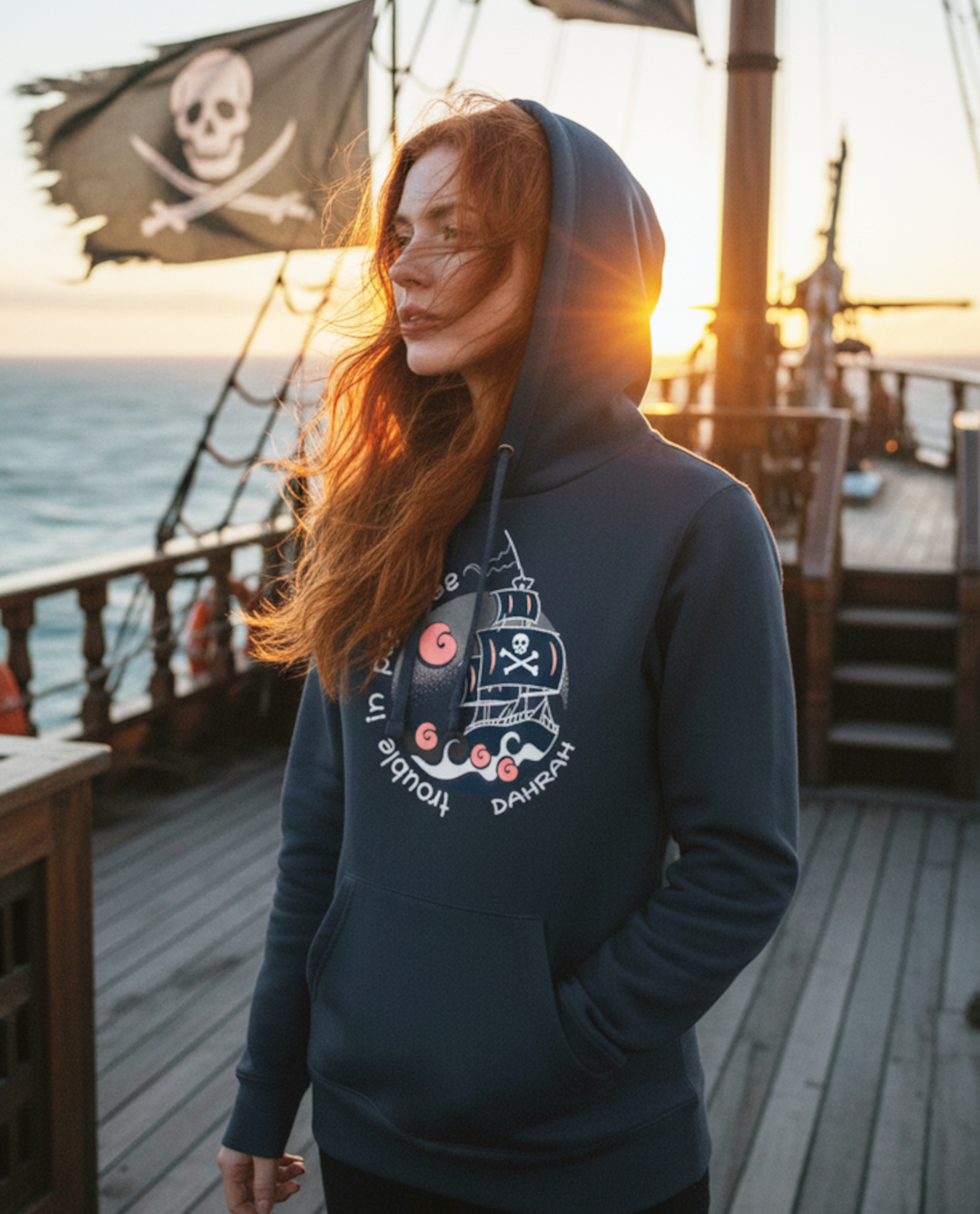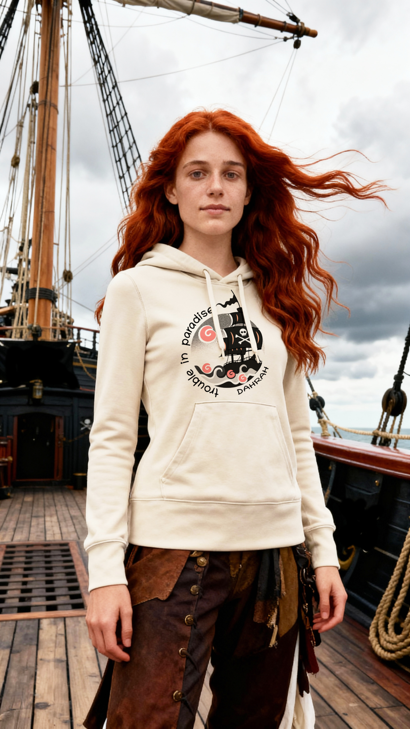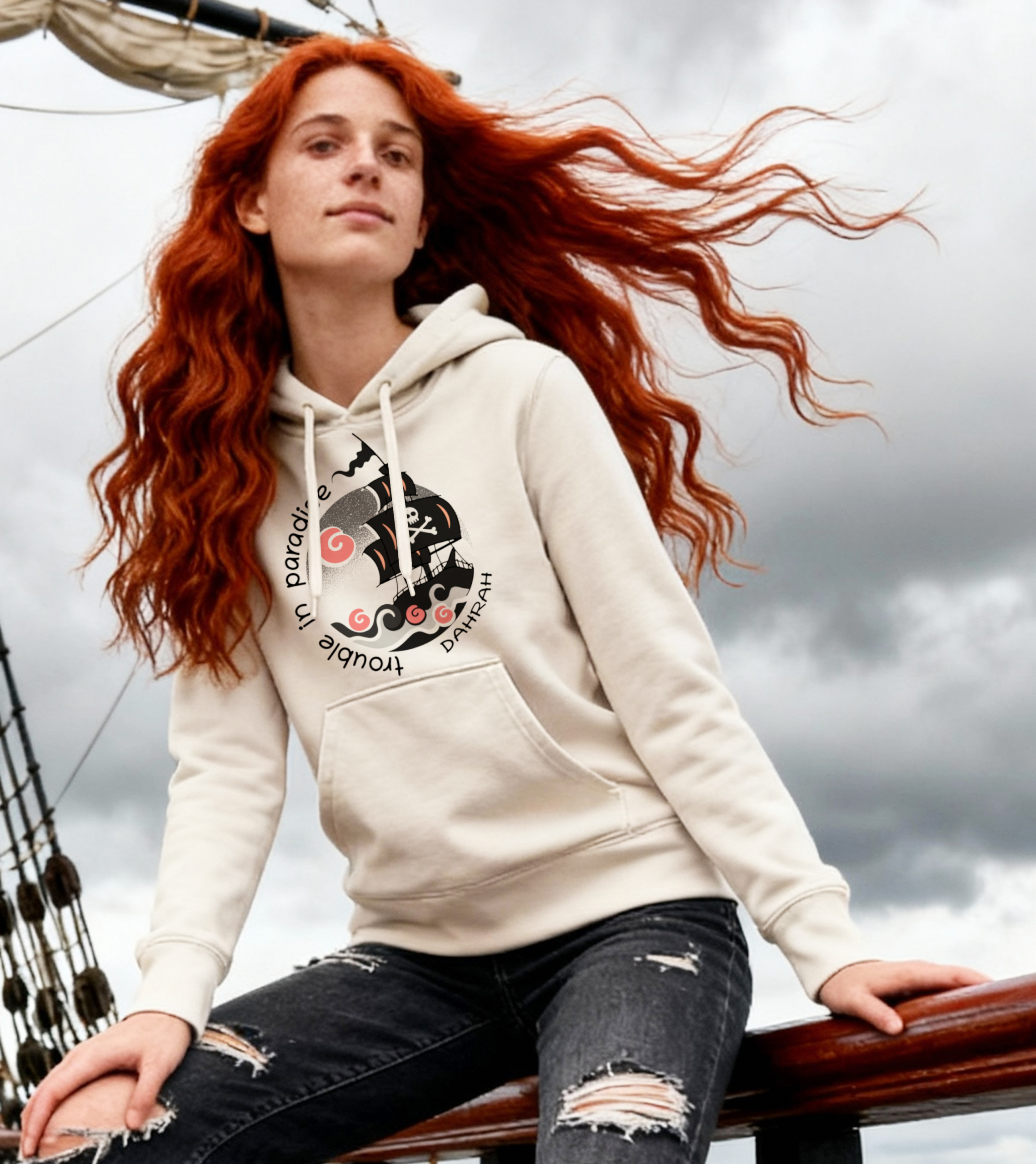 Sailing and surfing hoodie by DAHRAH with print of a pirate ship. Normal fit, for mid-season. 85% organic cotton, 15% recycled polyester, 280 GSM (gram per square meter). Vegan and OEKO-TEK certified. Click here for size advise: take a hoodie that you own which fits you well and compare the dimensions.