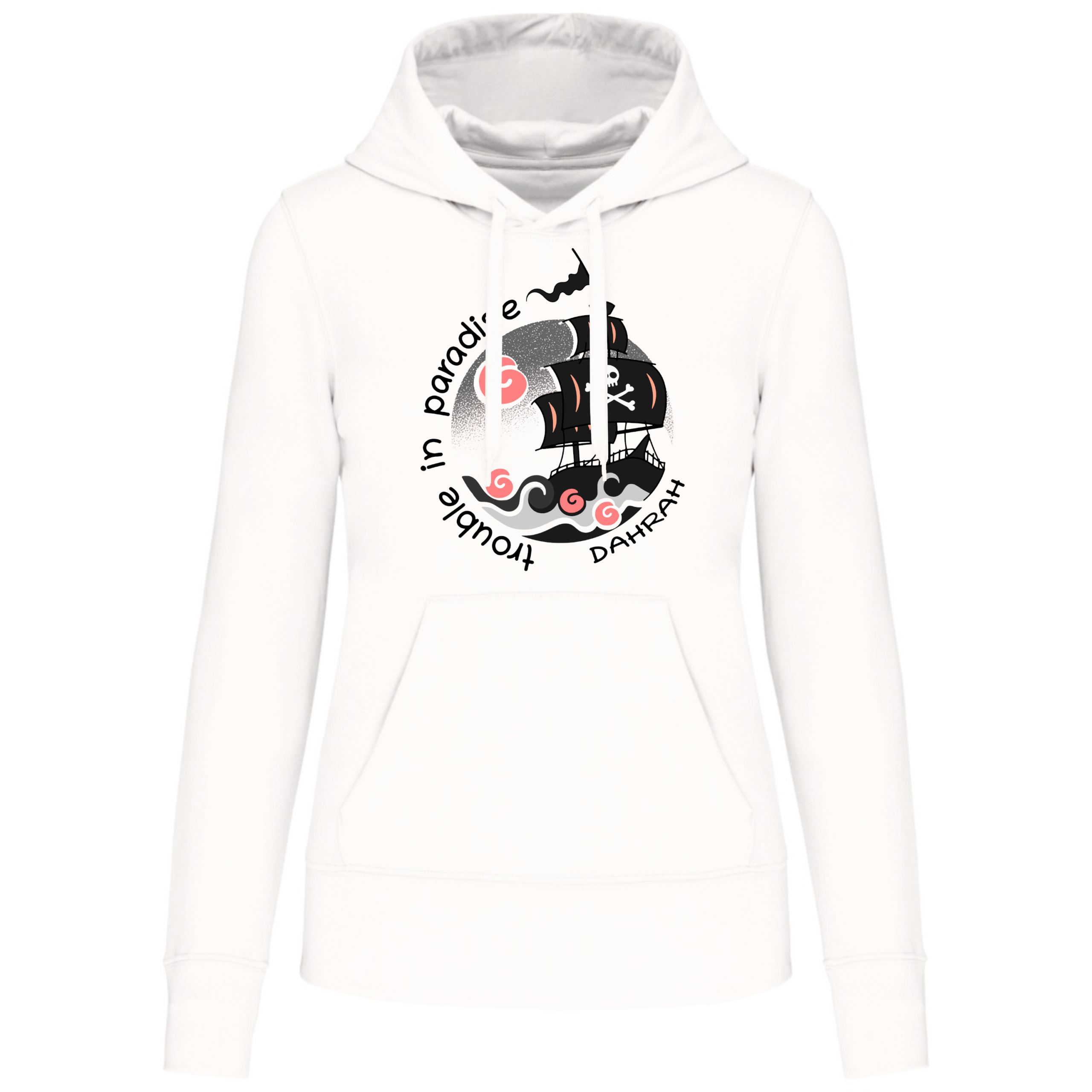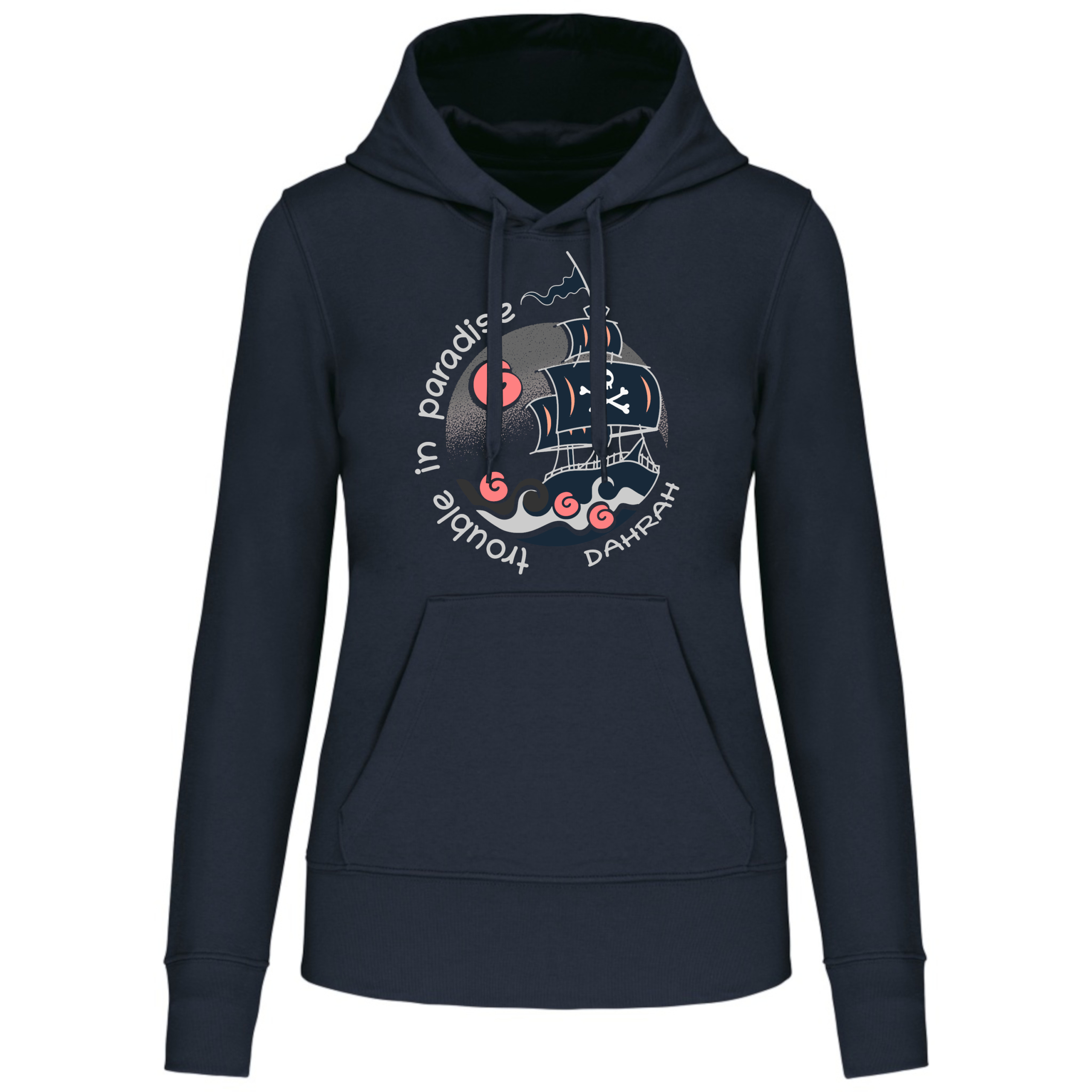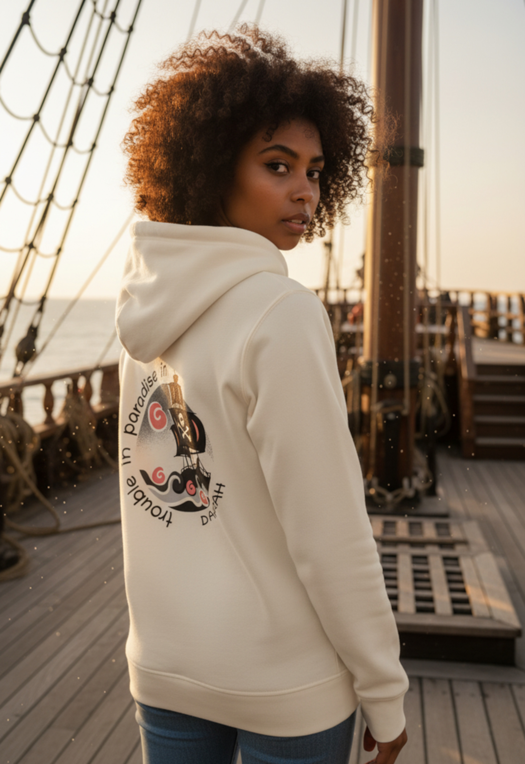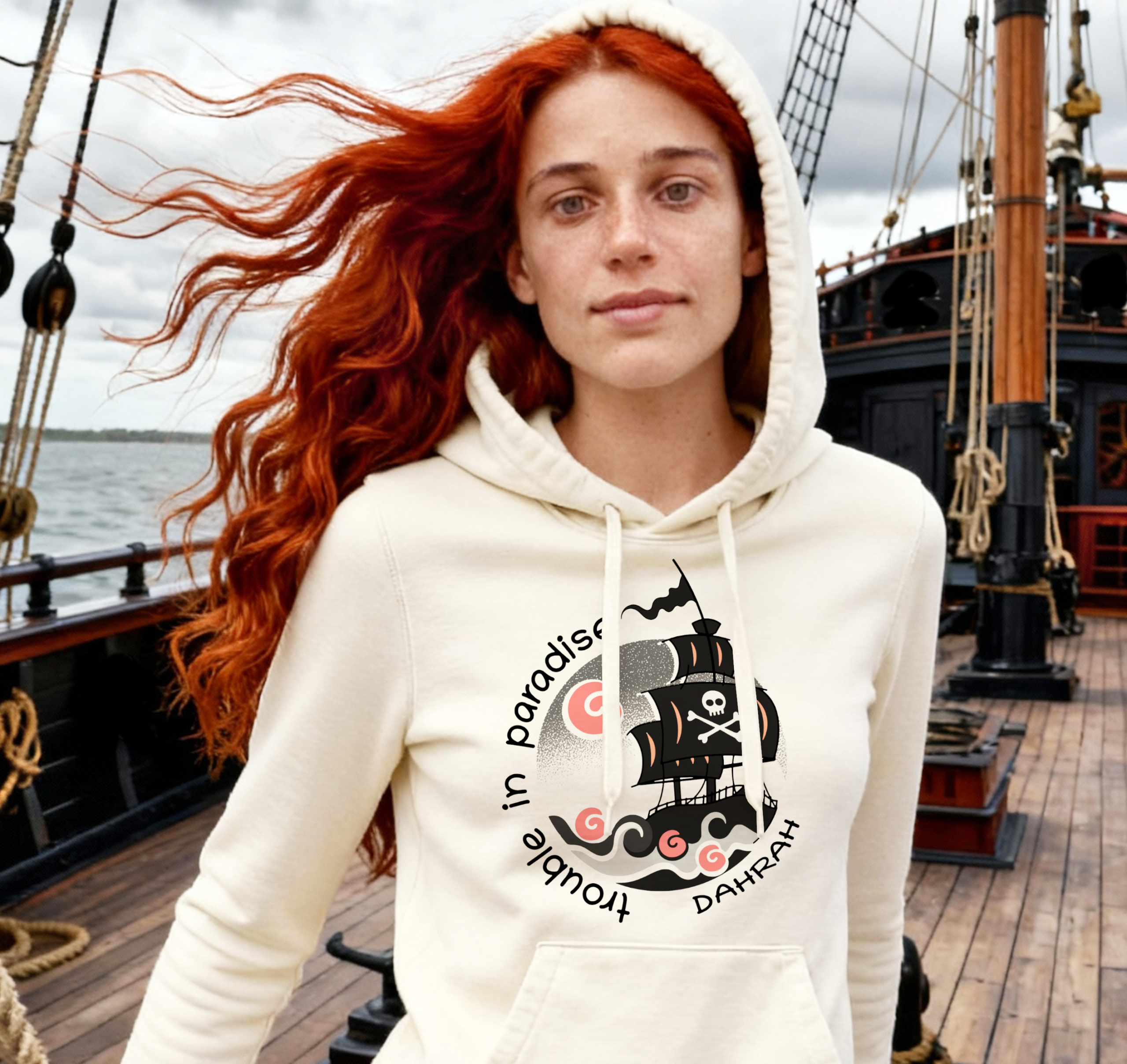 Sailing and surfing hoodie by DAHRAH with print of a pirate ship. Normal fit, for mid-season. 85% organic cotton, 15% recycled polyester, 280 GSM (gram per square meter). Vegan and OEKO-TEK certified. Click here for size advise: take a hoodie that you own which fits you well and compare the dimensions.