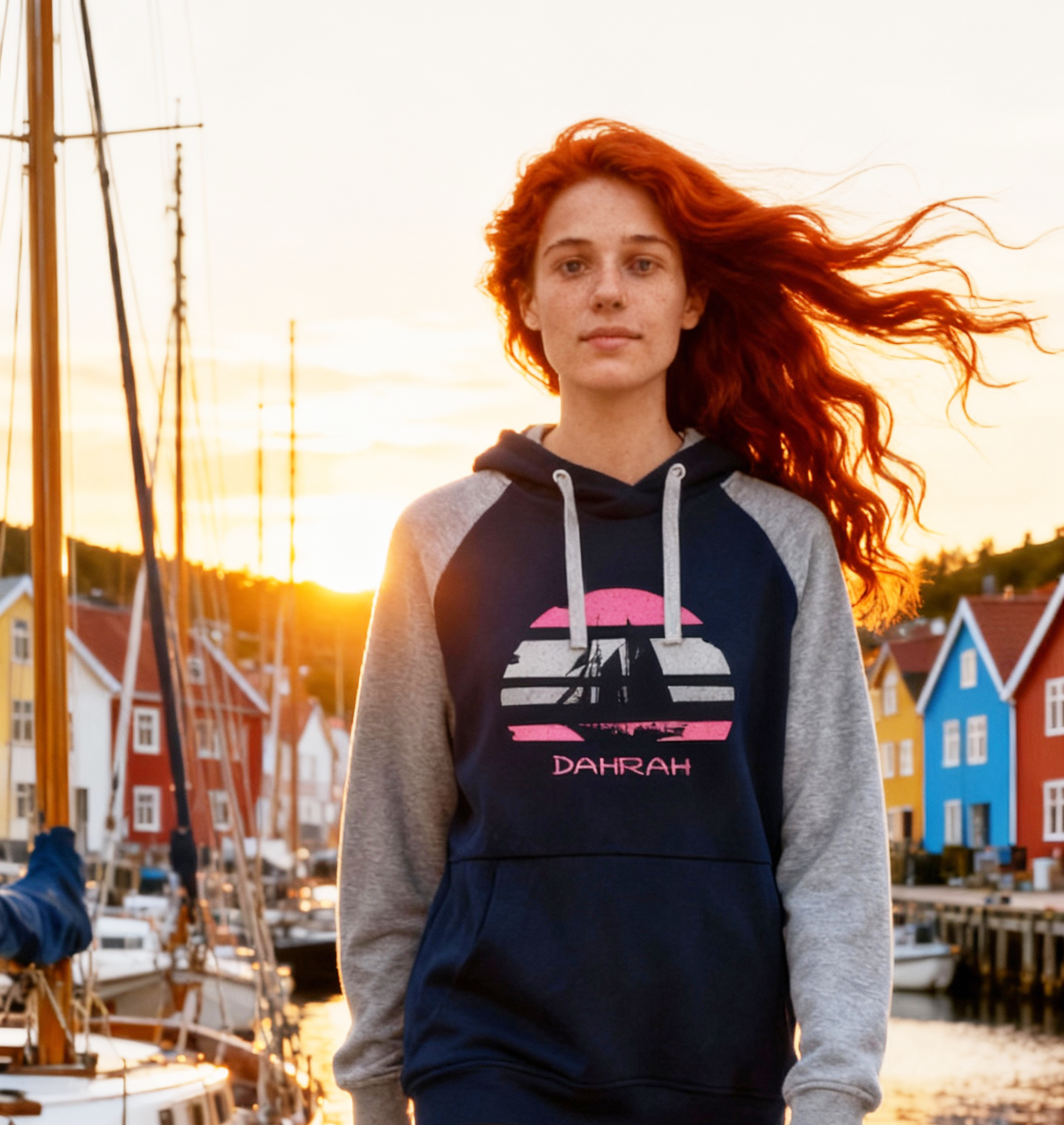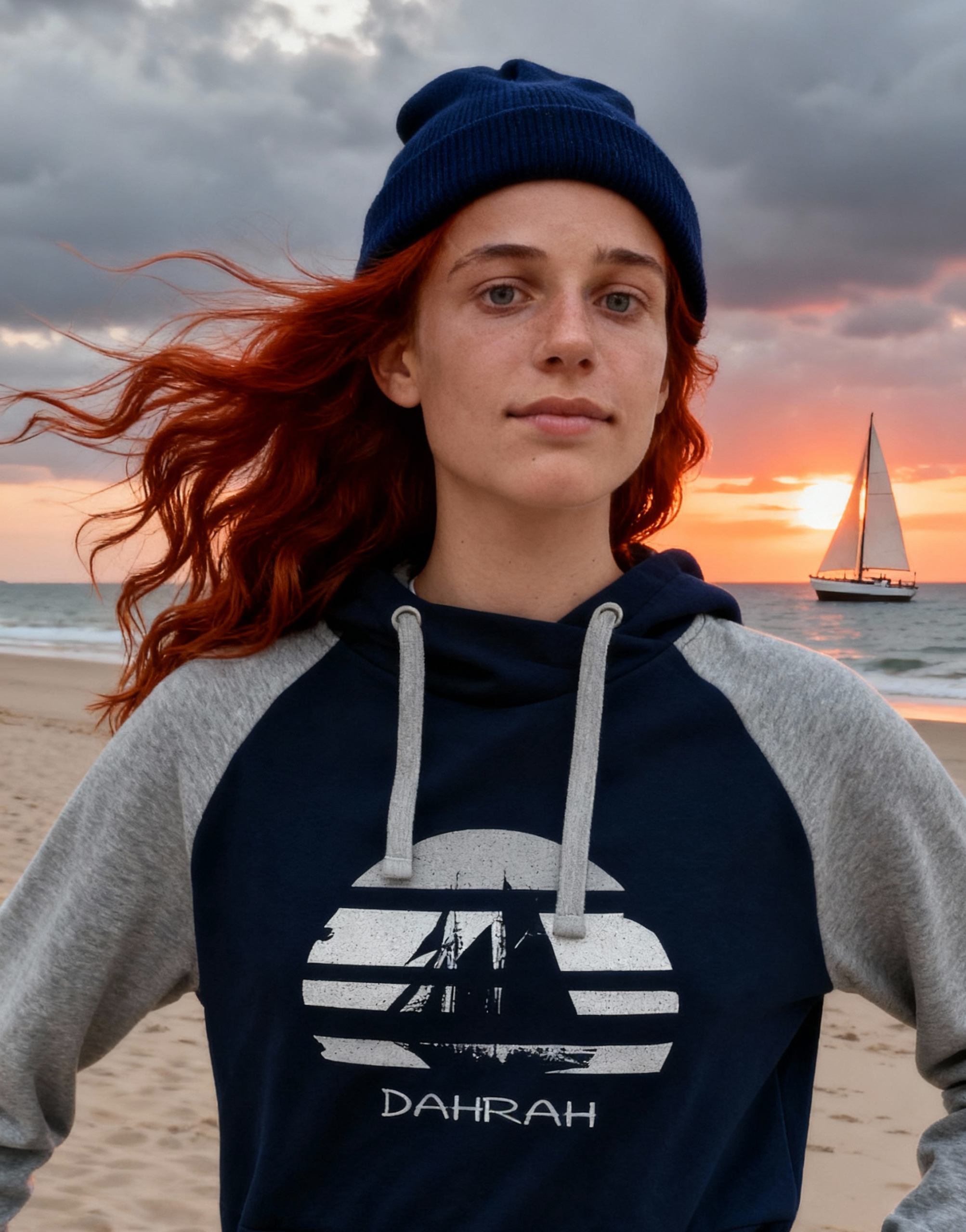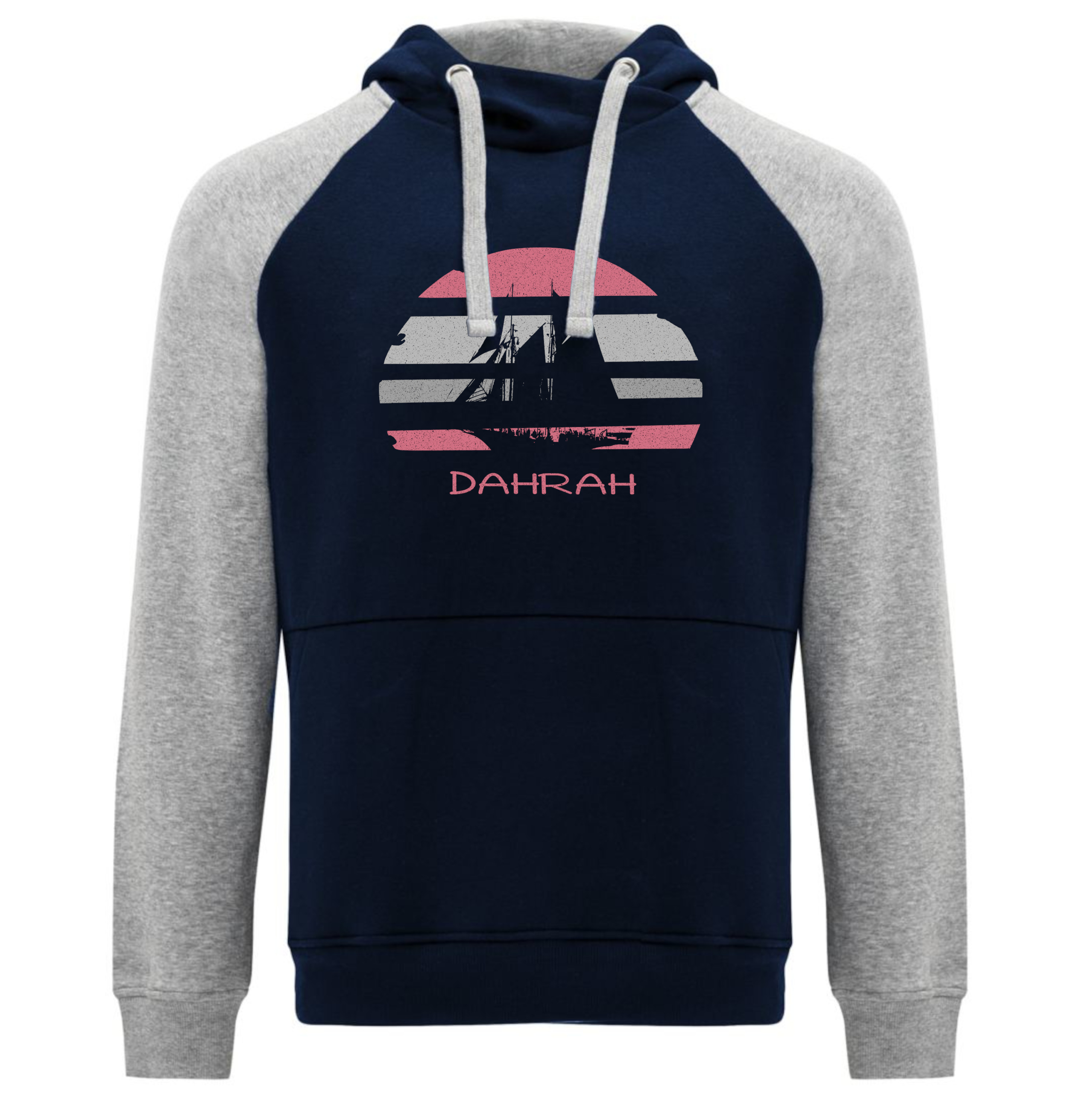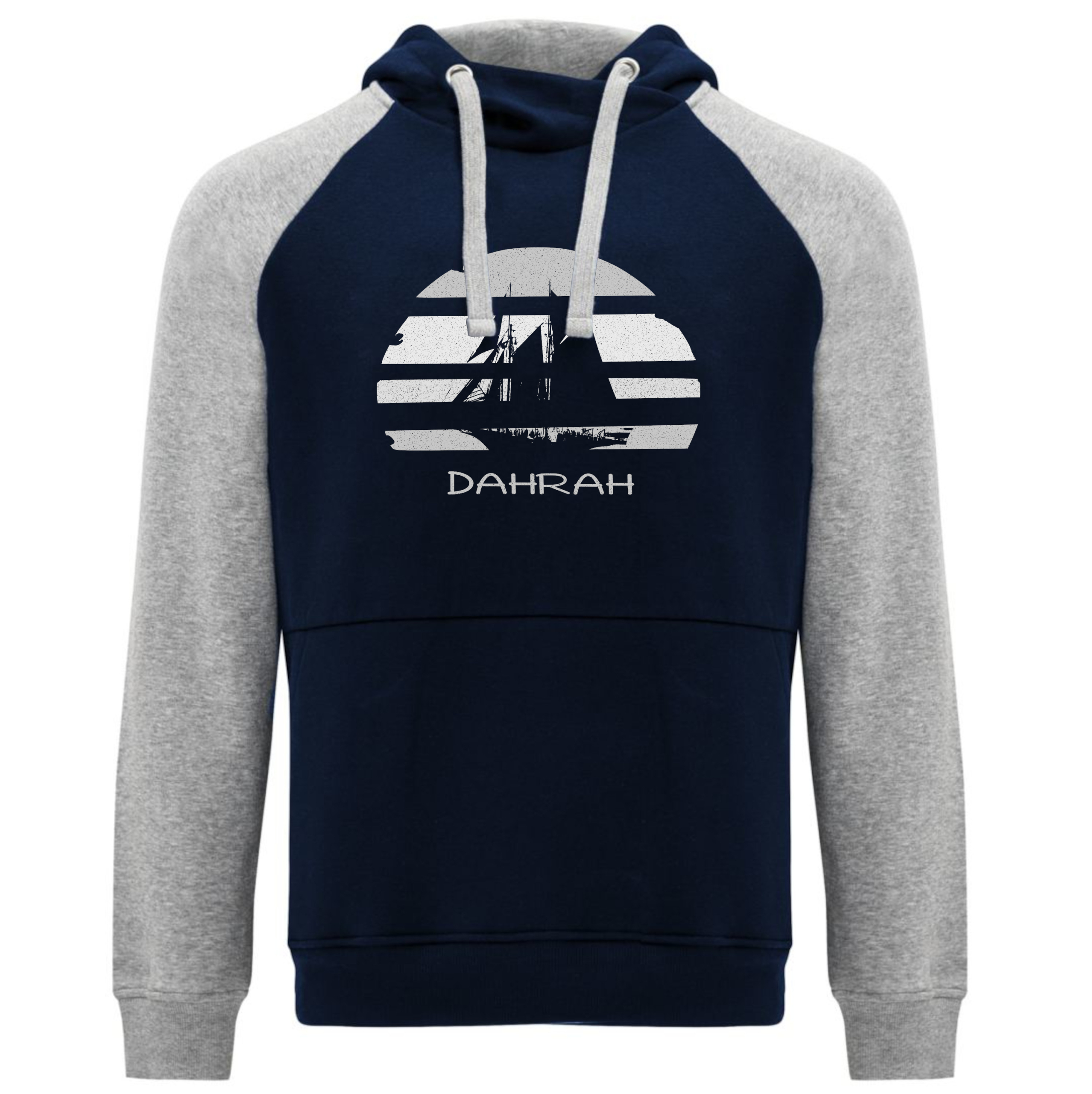 Sailing hoodie by DAHRAH, with print of Flying Dutchman sailboat at sunset. Normal fit, bi-color and raglan sleeves. For winter or mid-season. 80% organic cotton, 20% recycled polyester, 350 GSM (gram per square meter). Vegan and OEKO-TEK certified. Click here for size advise: take a hoodie that you own which fits you well and compare the dimensions.