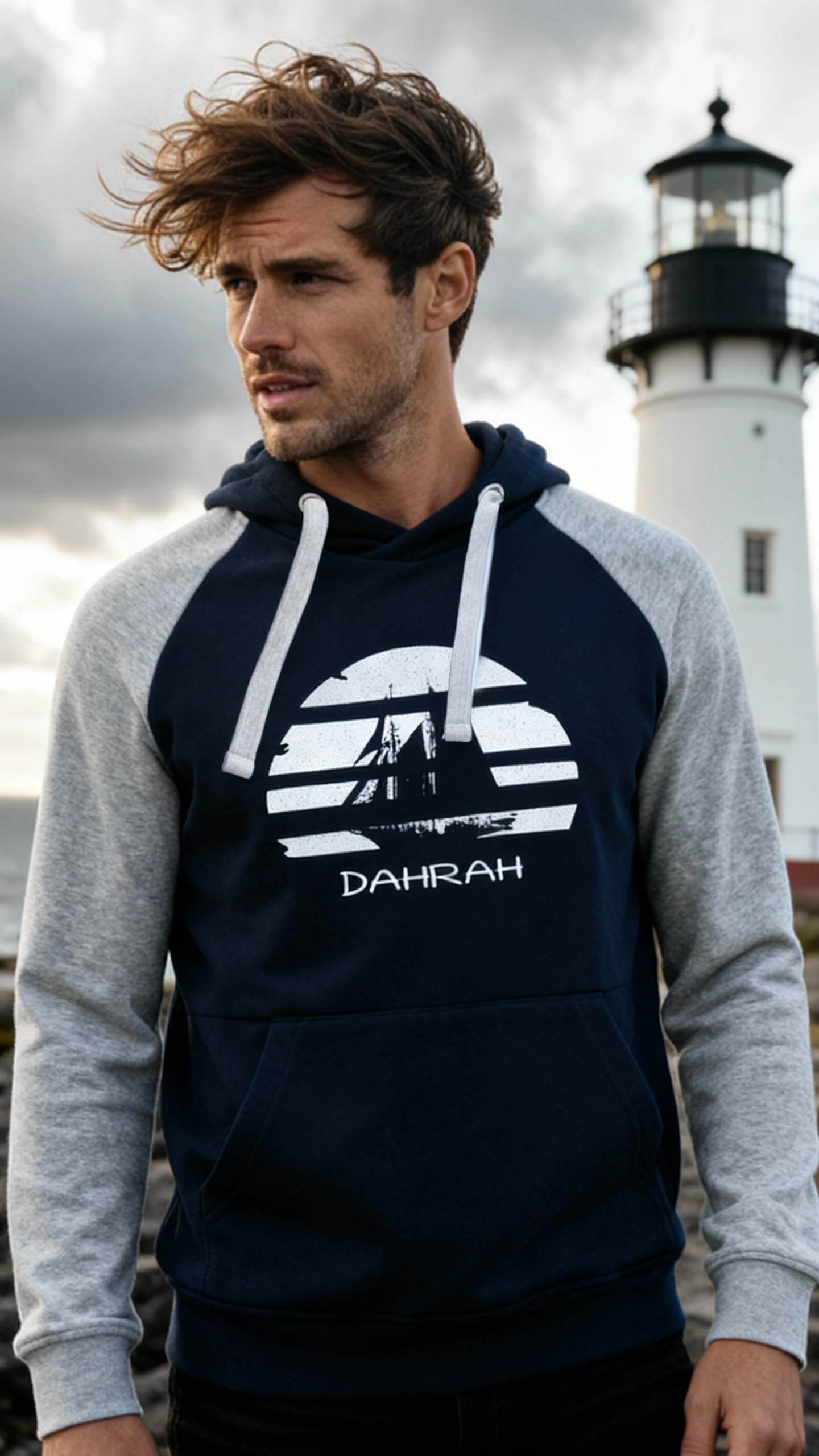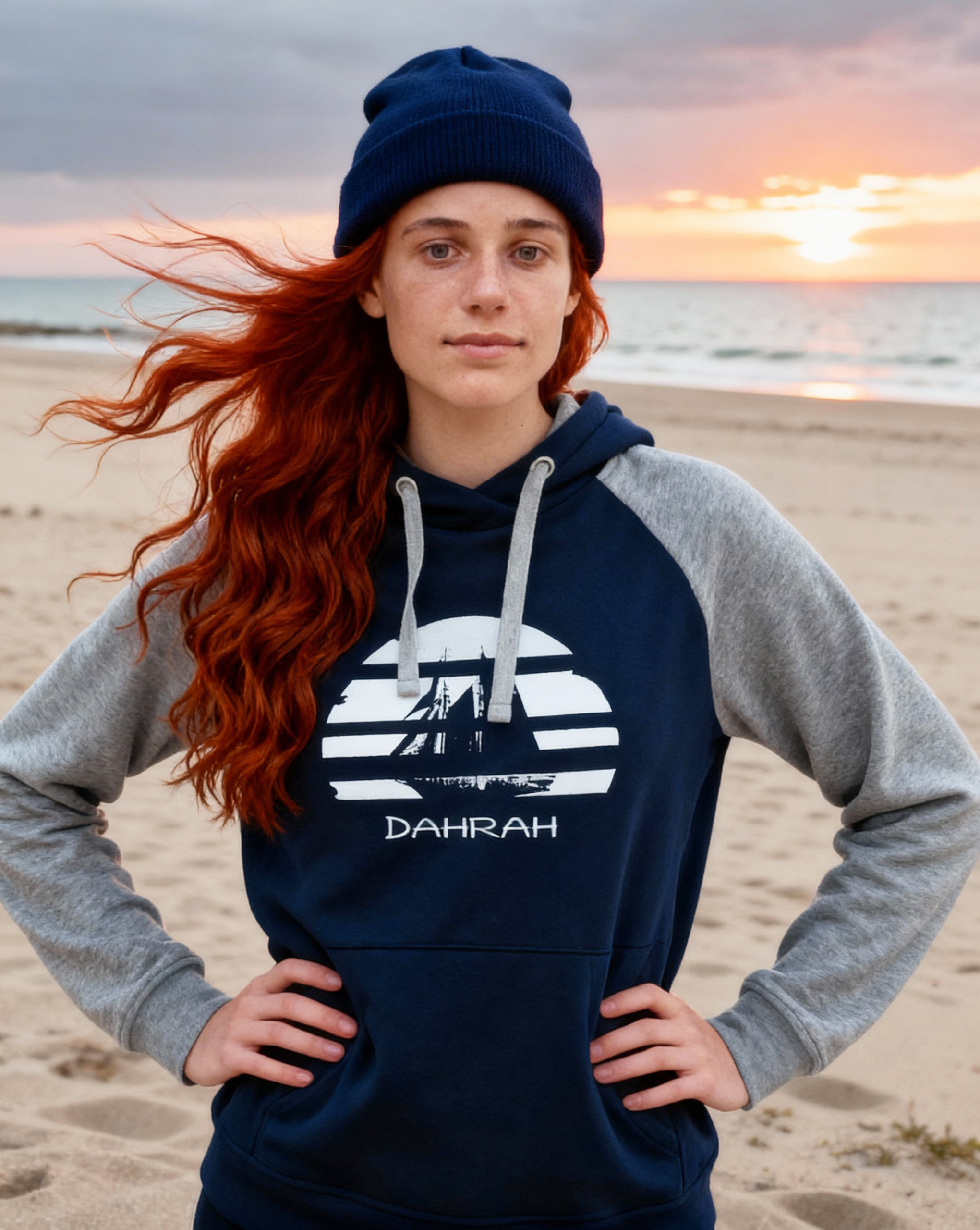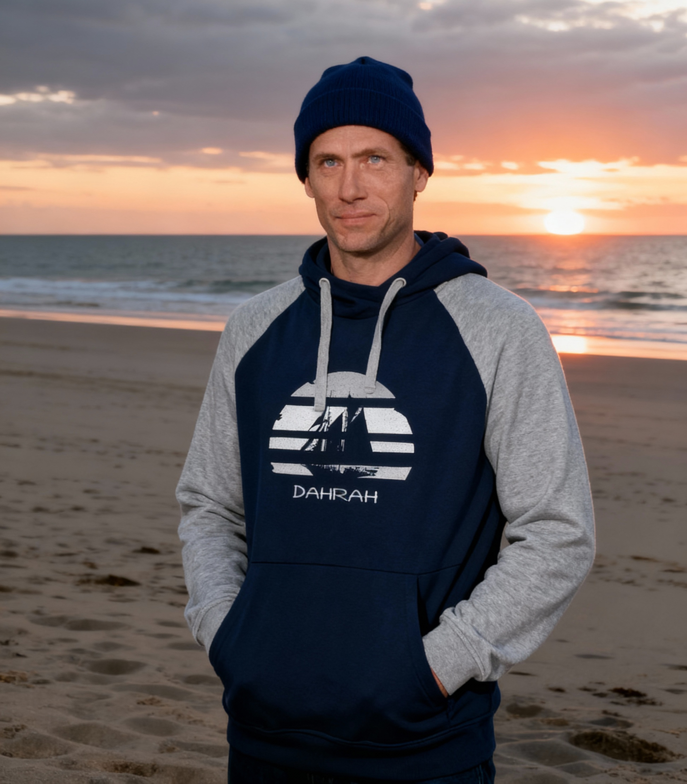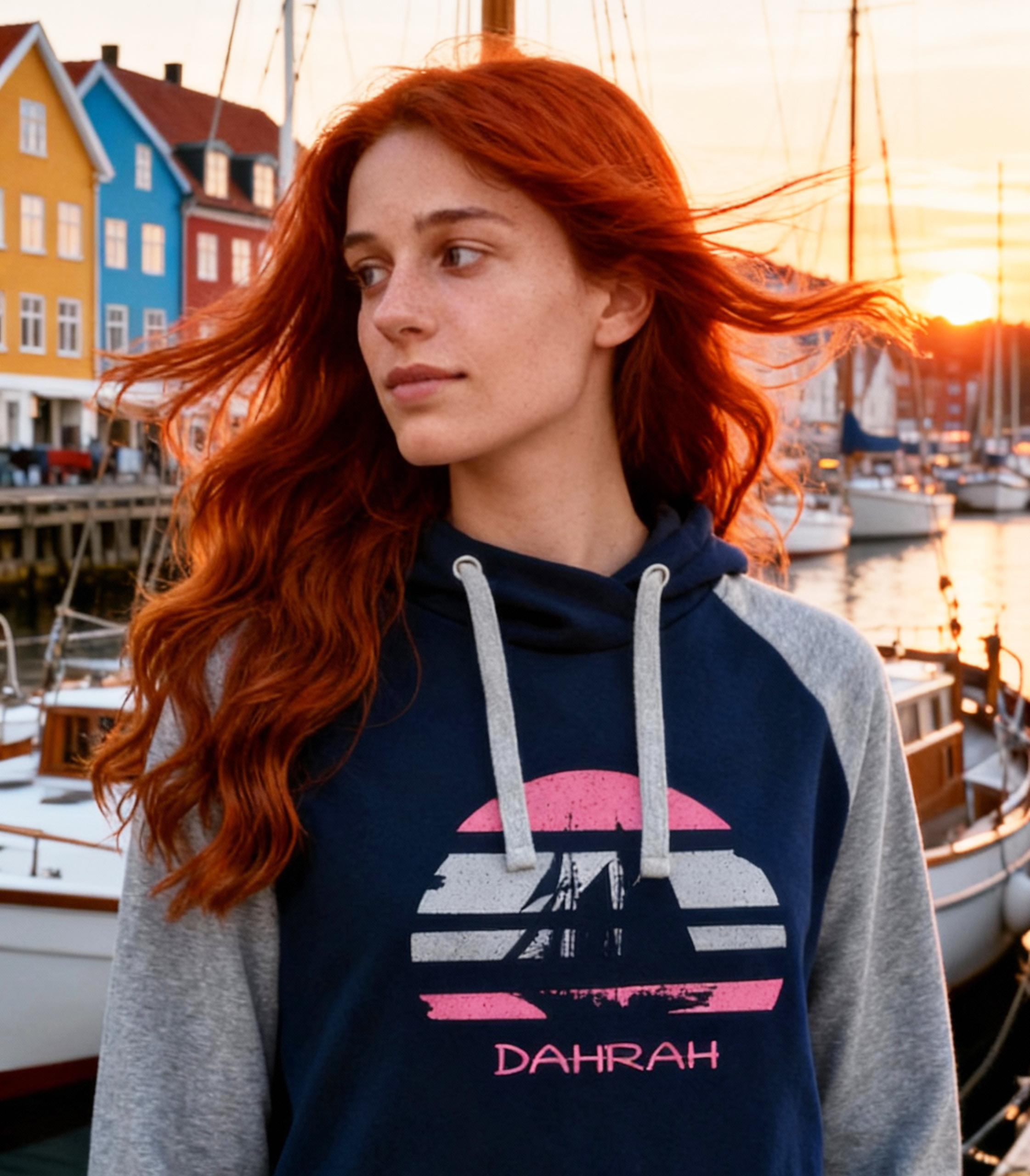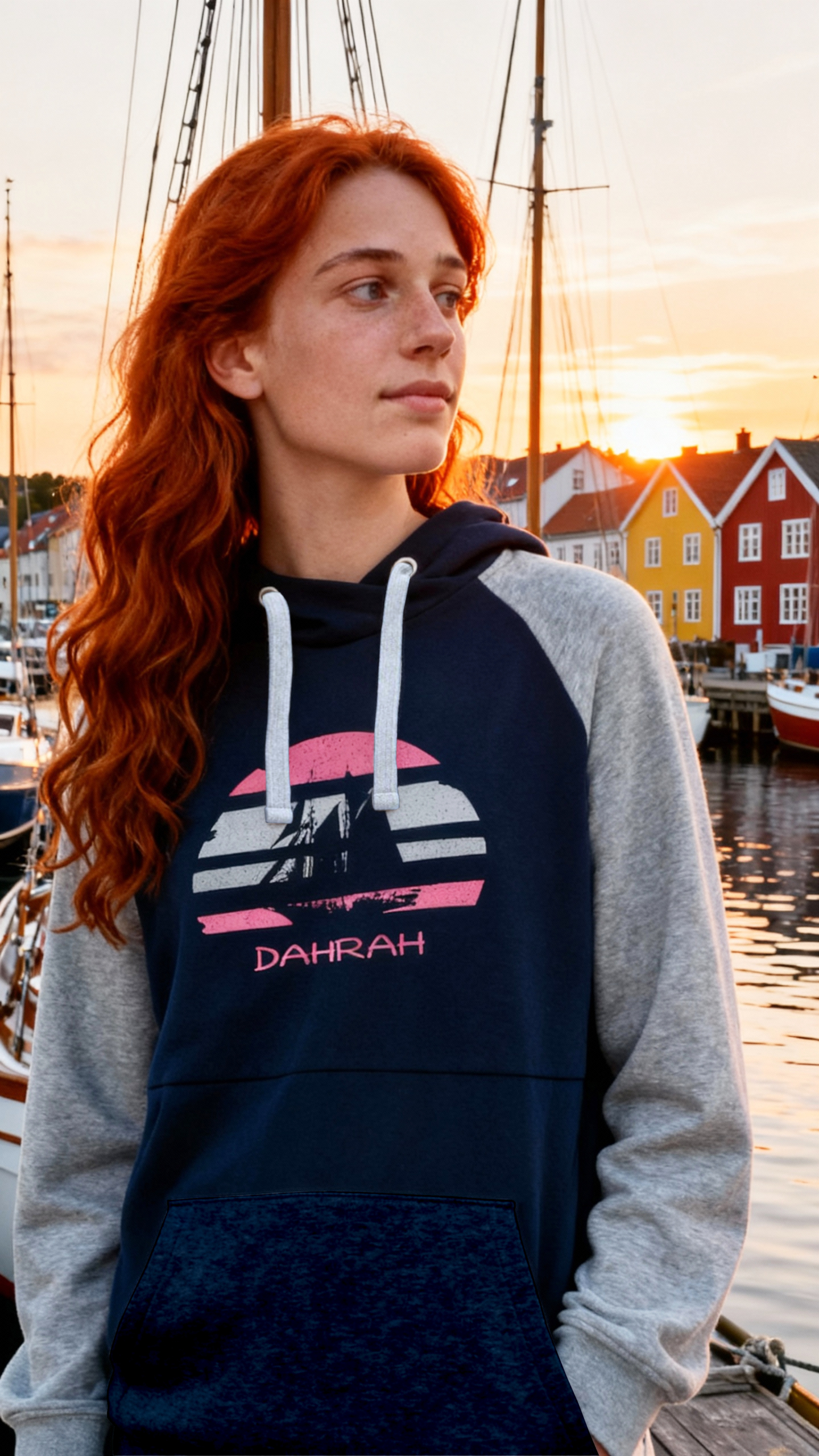 Sailing hoodie by DAHRAH, with print of Flying Dutchman sailboat at sunset. Normal fit, bi-color and raglan sleeves. For winter or mid-season. 80% organic cotton, 20% recycled polyester, 350 GSM (gram per square meter). Vegan and OEKO-TEK certified. Click here for size advise: take a hoodie that you own which fits you well and compare the dimensions.