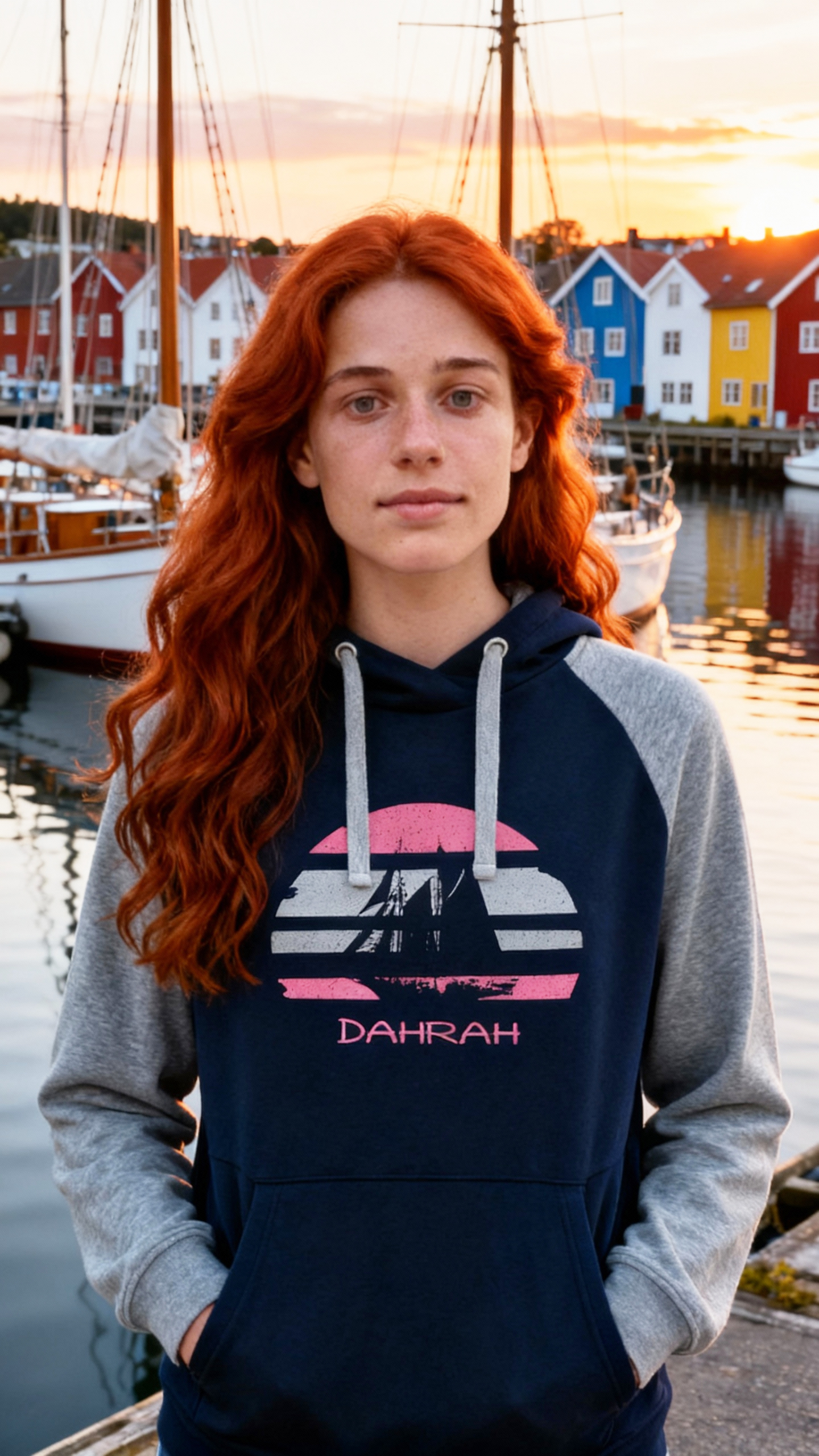 Sailing hoodie by DAHRAH, with print of Flying Dutchman sailboat at sunset. Unisex hoodie, normal fit for mid-season.