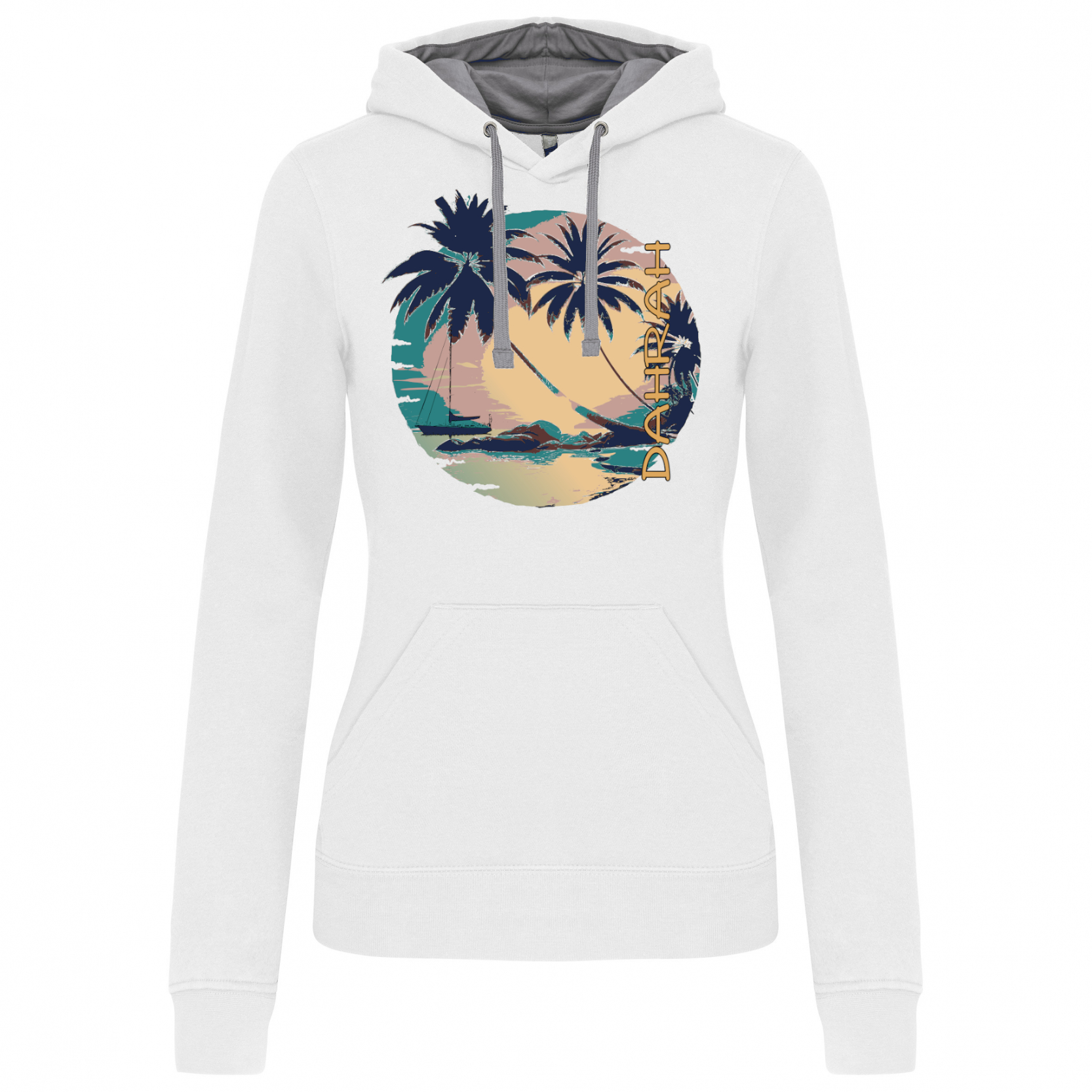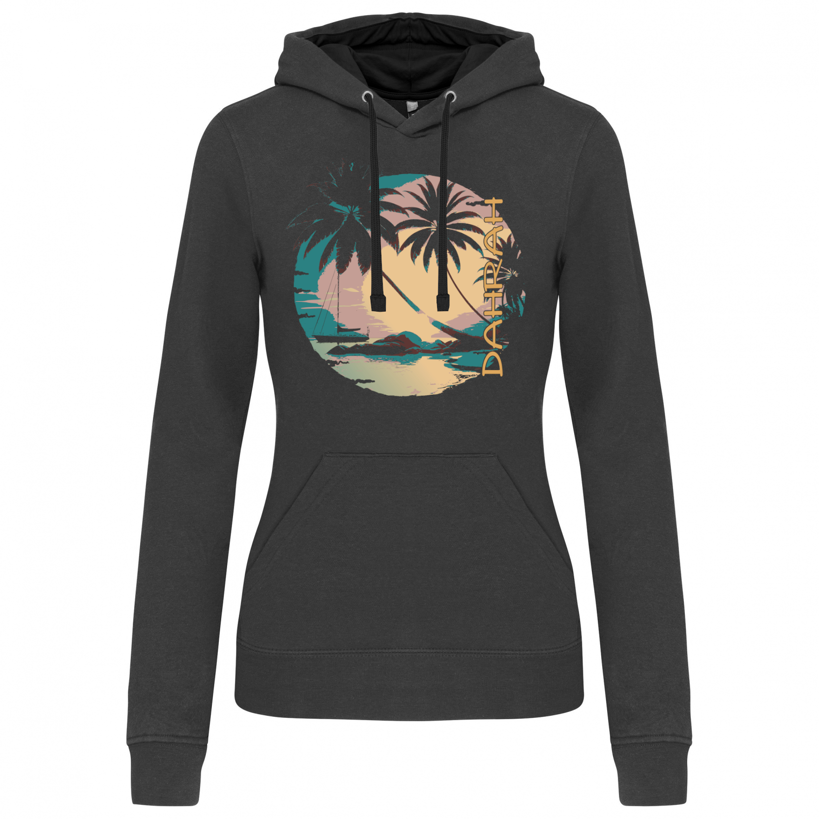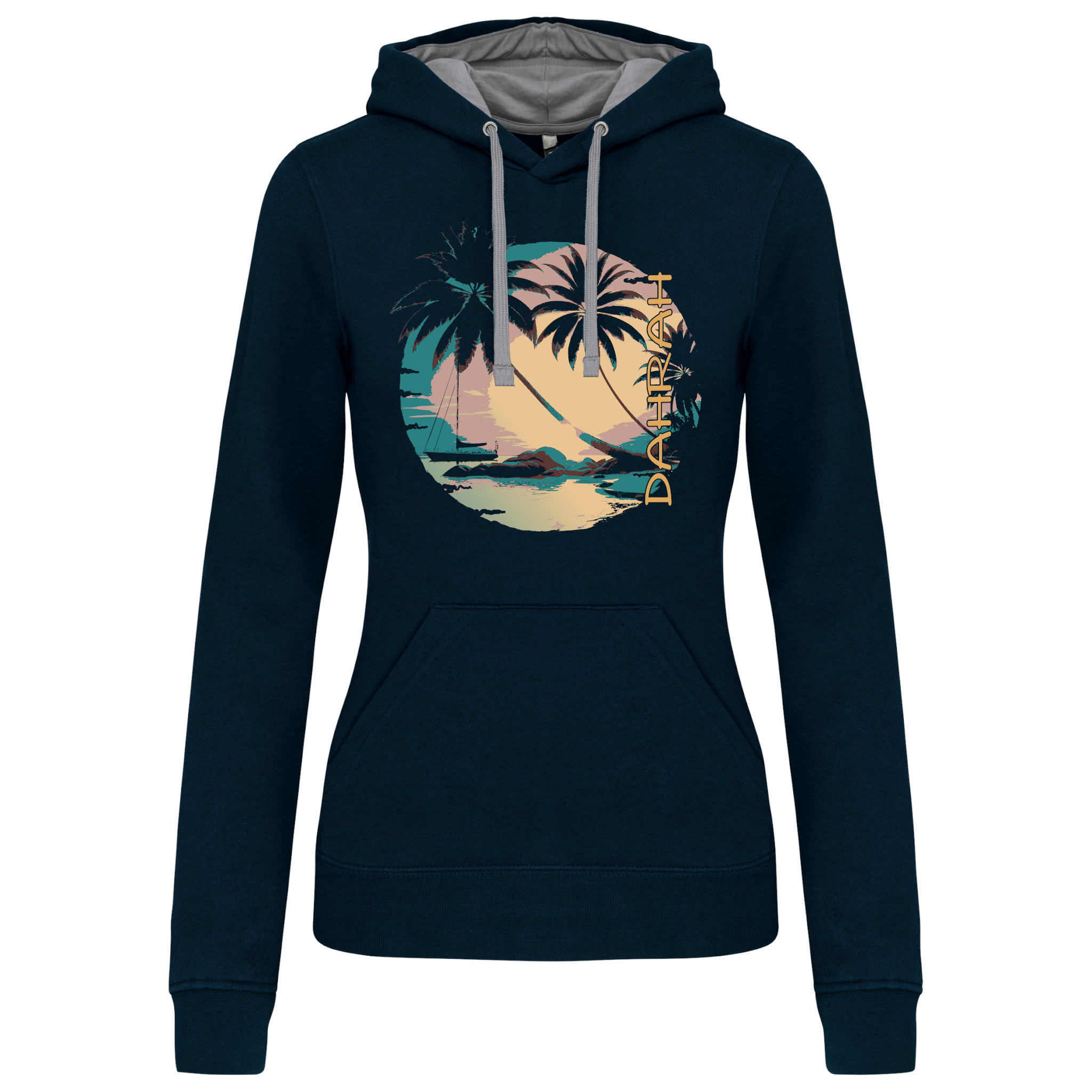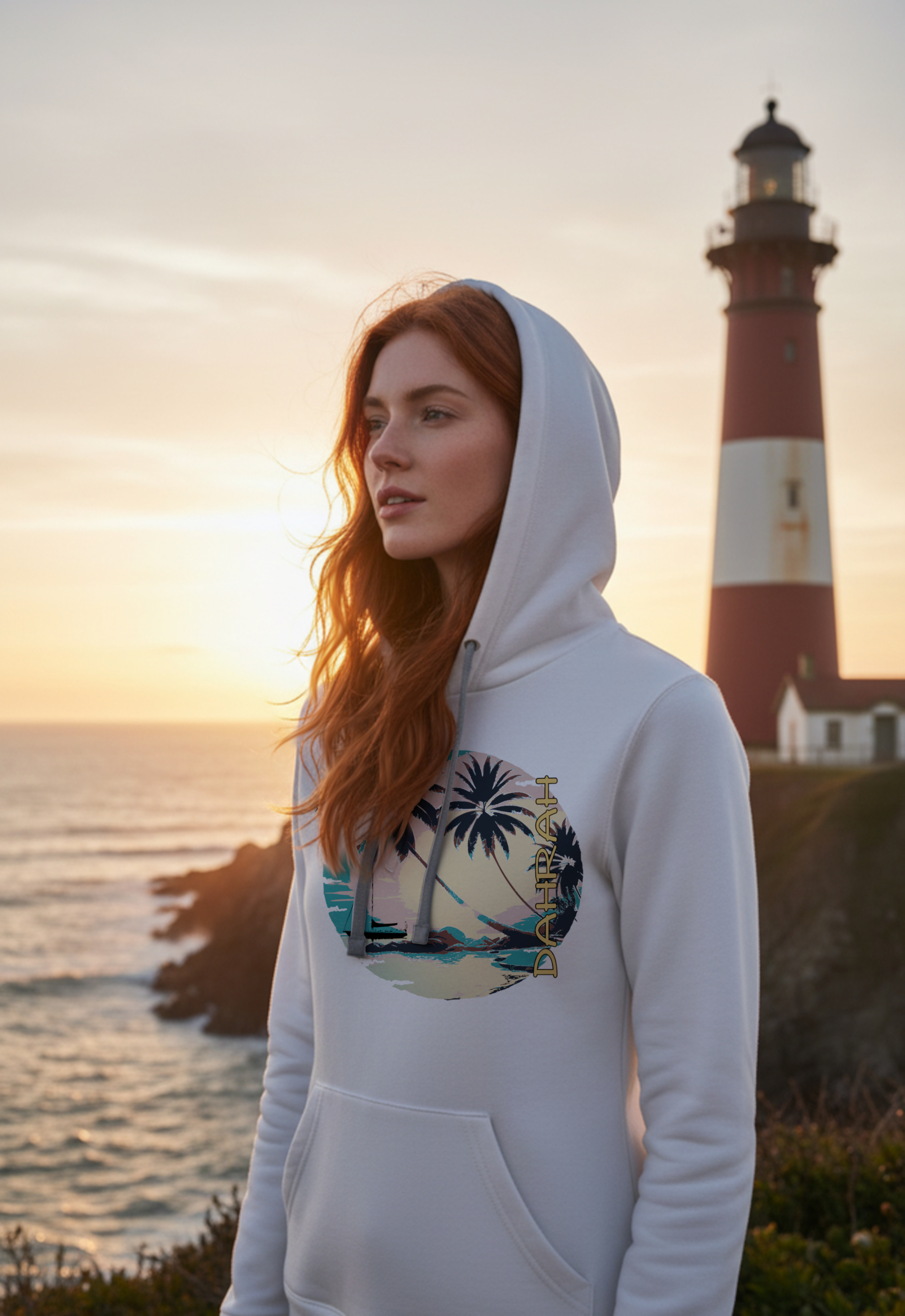 Sailing unisex hoodie with print of a sailboat and a tropical beach. Normal fit for mid-season.