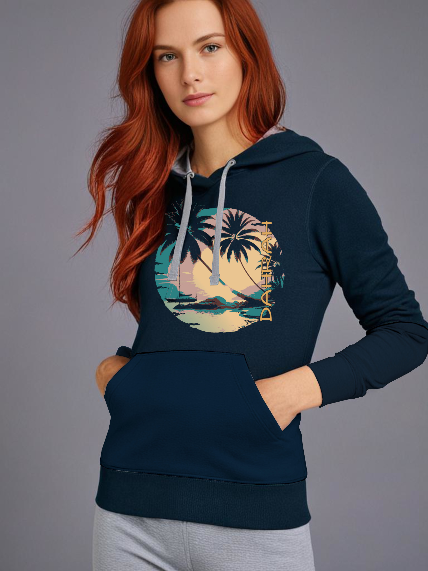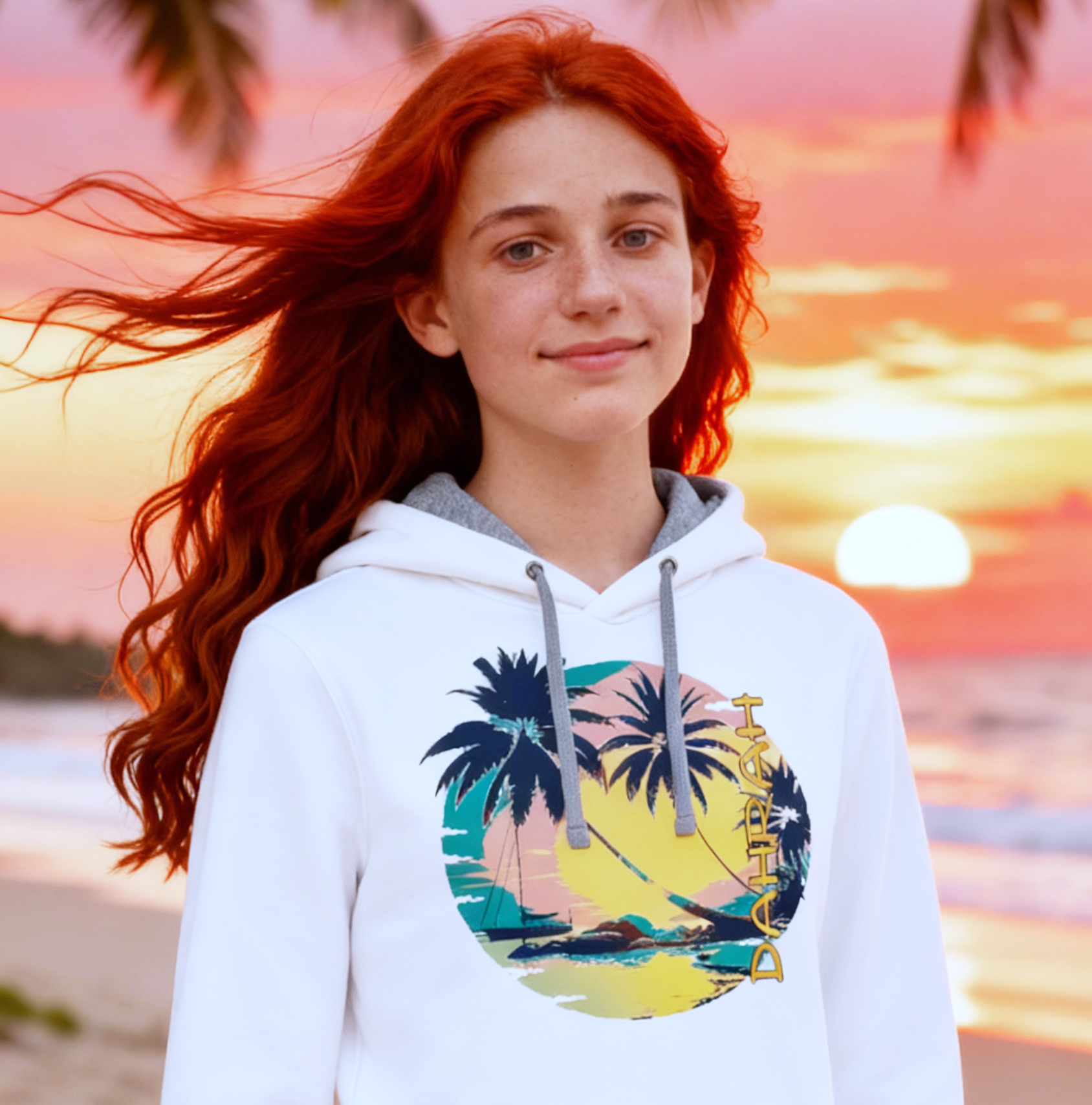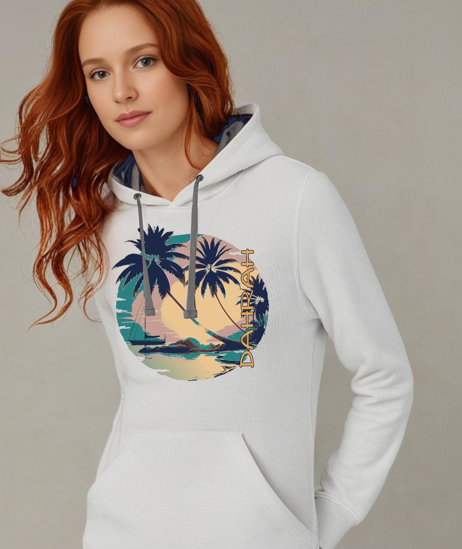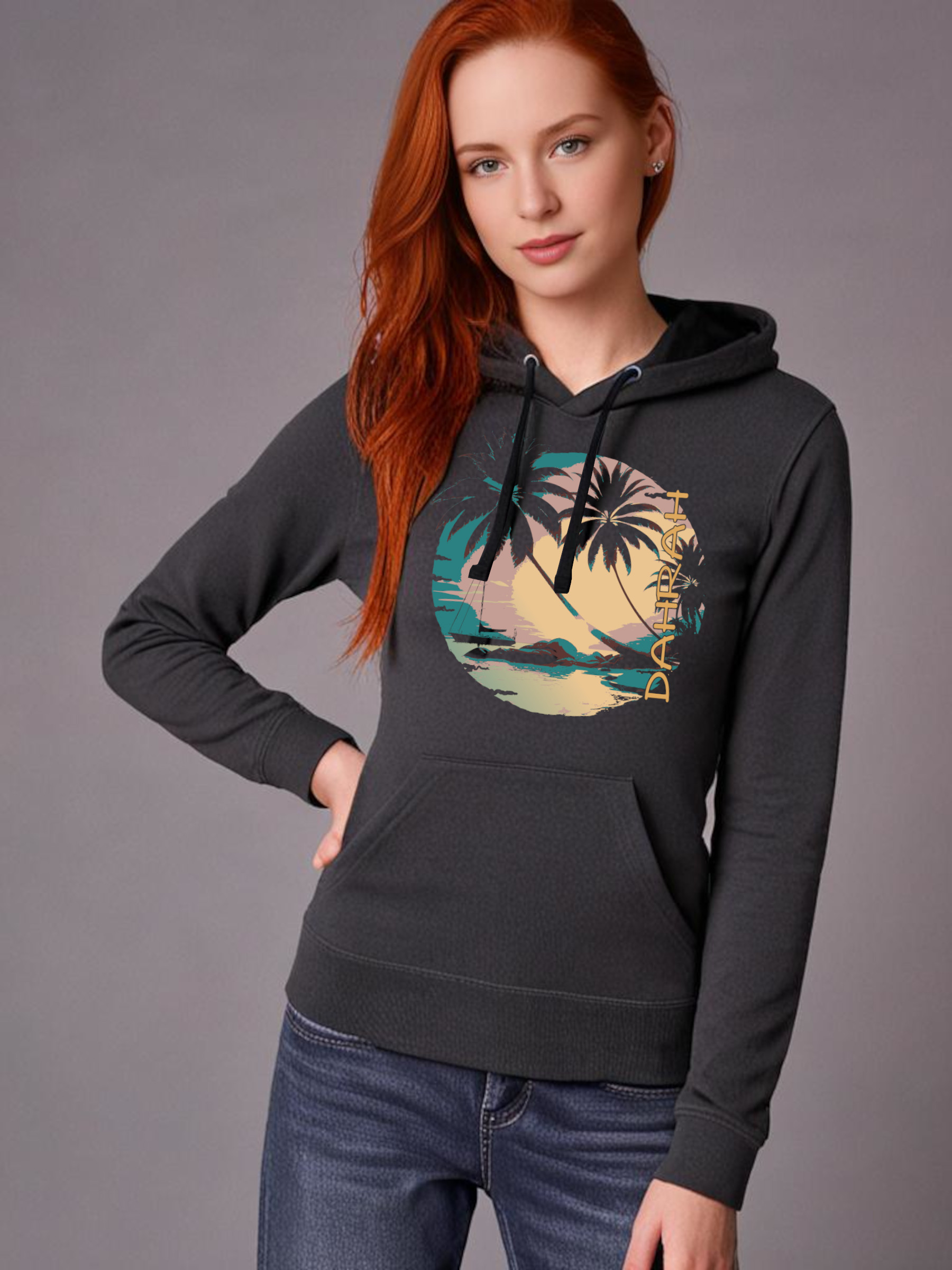 Sailing unisex hoodie with print of a sailboat and a tropical beach. Normal fit for mid-season.