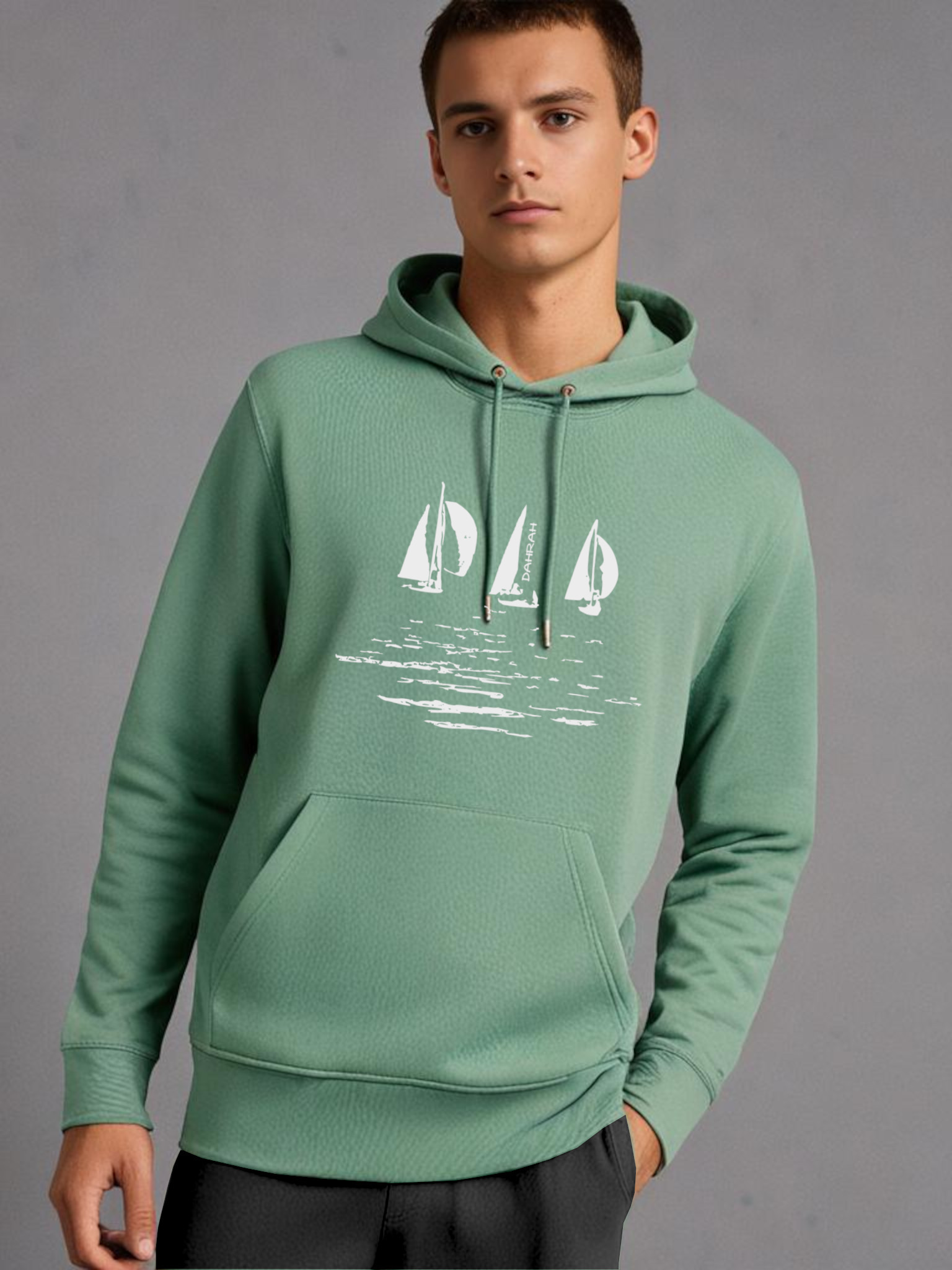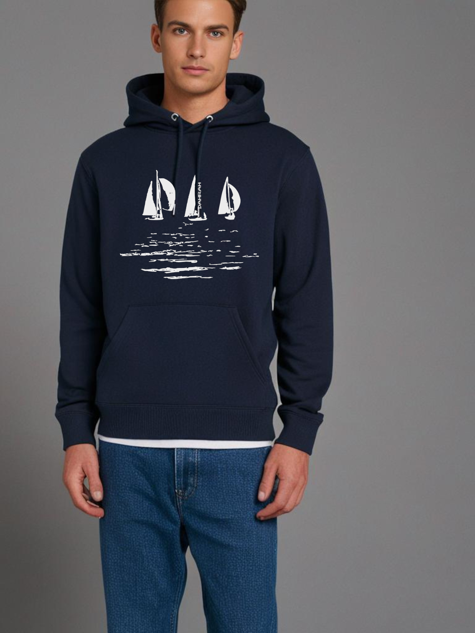 Unisex sailing unisex hoodie with print of a three sailboats. Normal fit for mid-season.