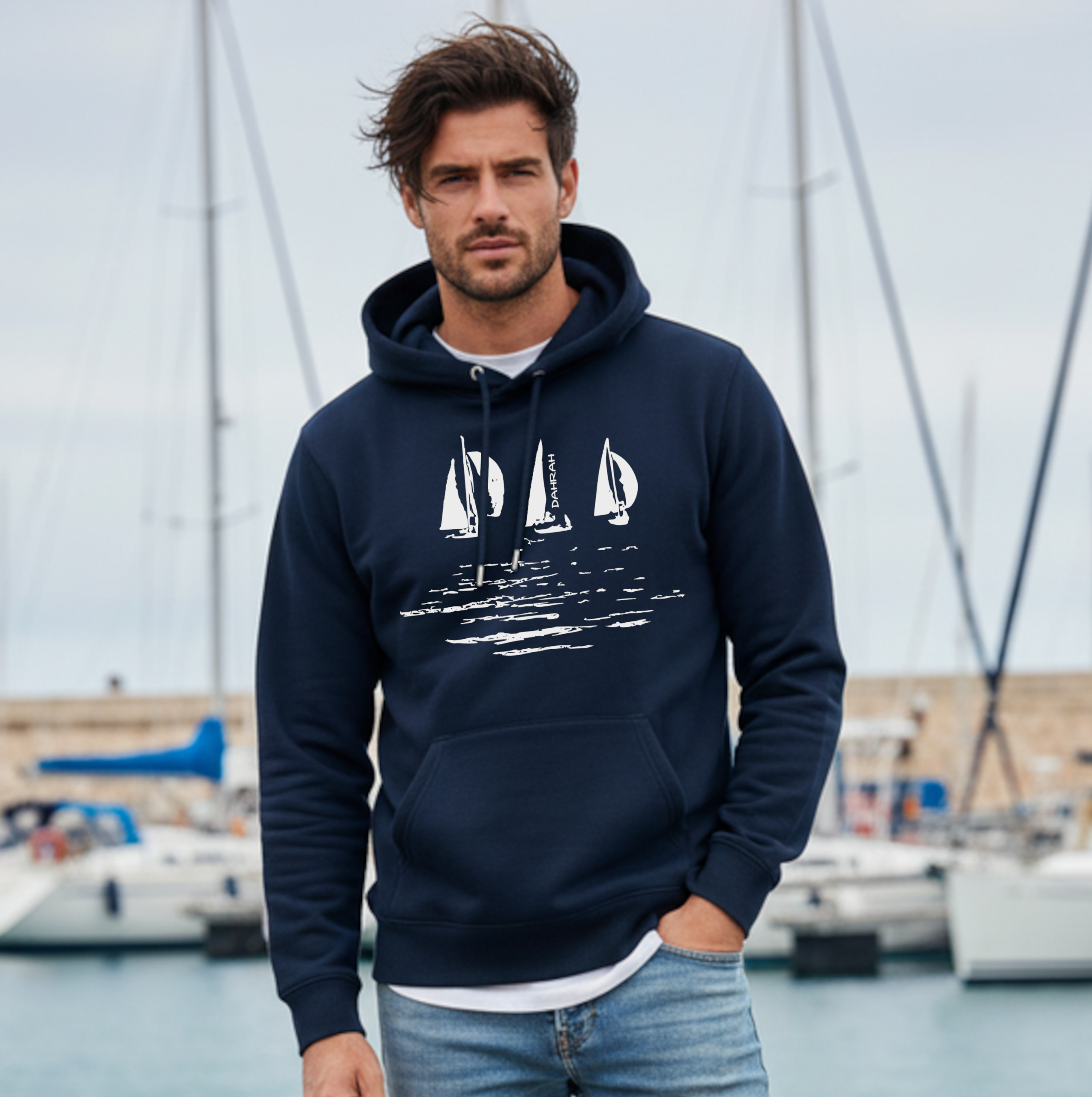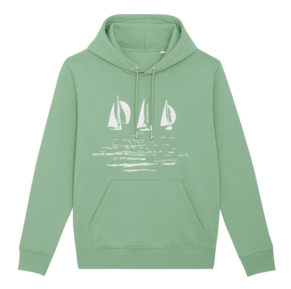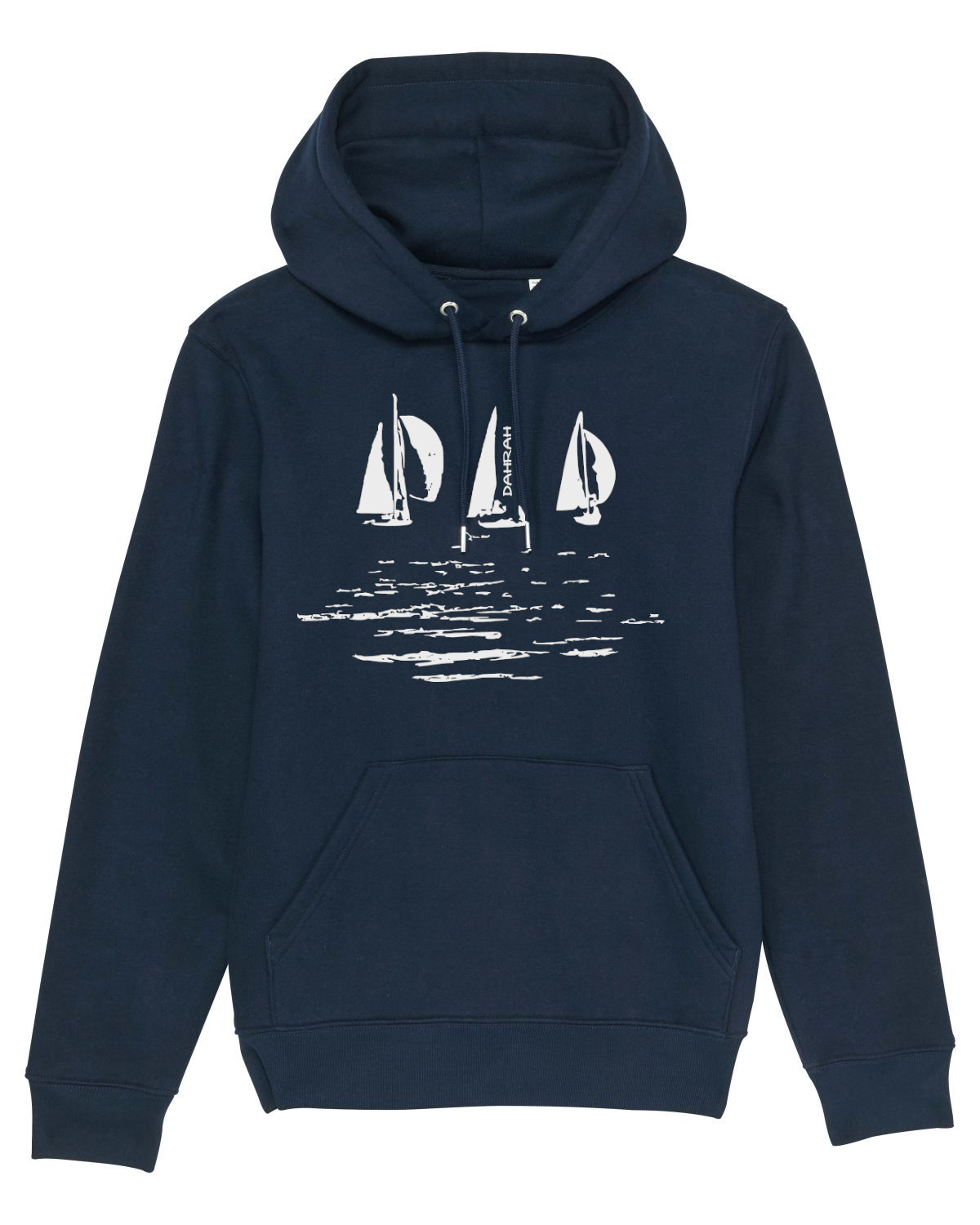 Unisex sailing hoodie by DAHRAH, normal fit, for winter or mid-season. 80% organic cotton, 20% recycled polyester, 350 GSM (gram per square meter). Vegan and OEKO-TEK certified. Click here for size advise: take a hoodie that you own which fits you well and compare the dimensions.