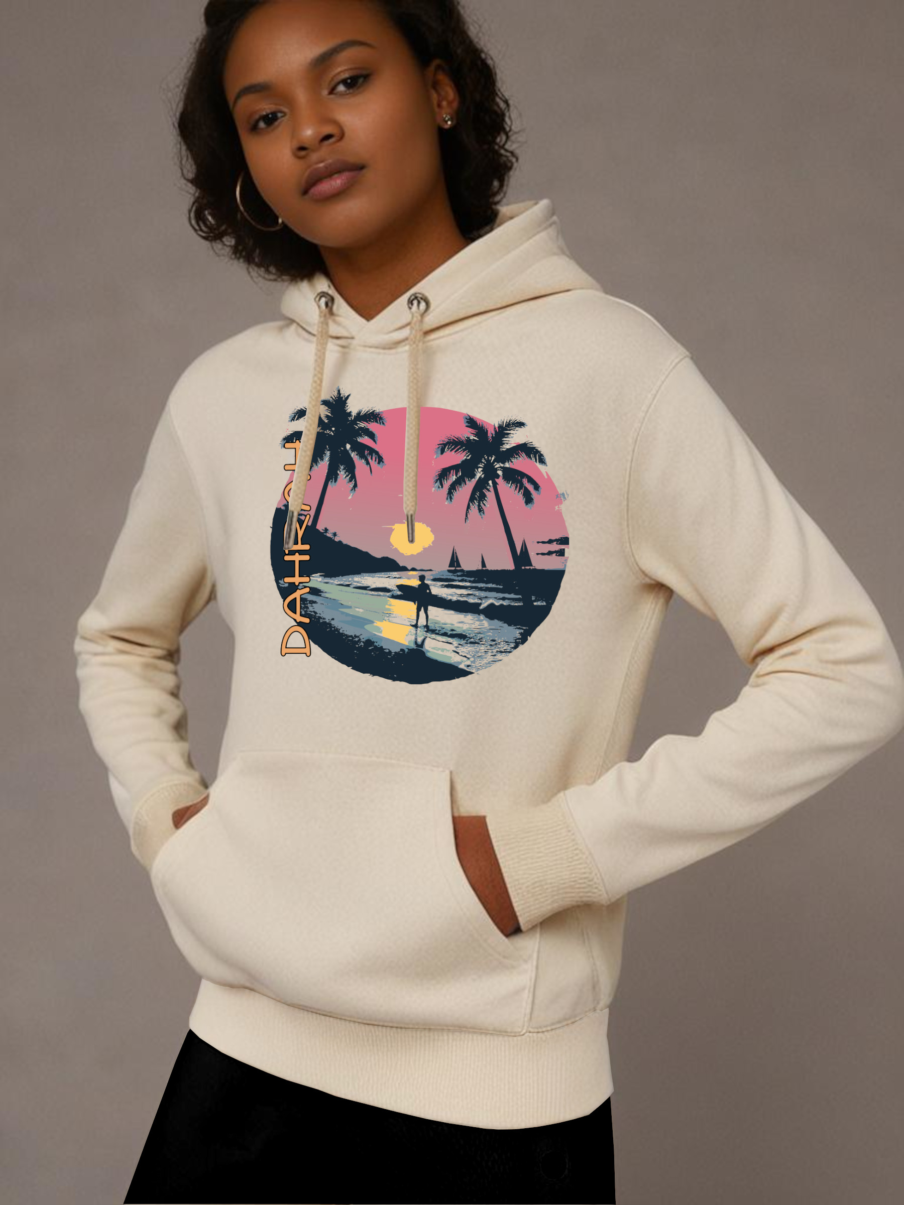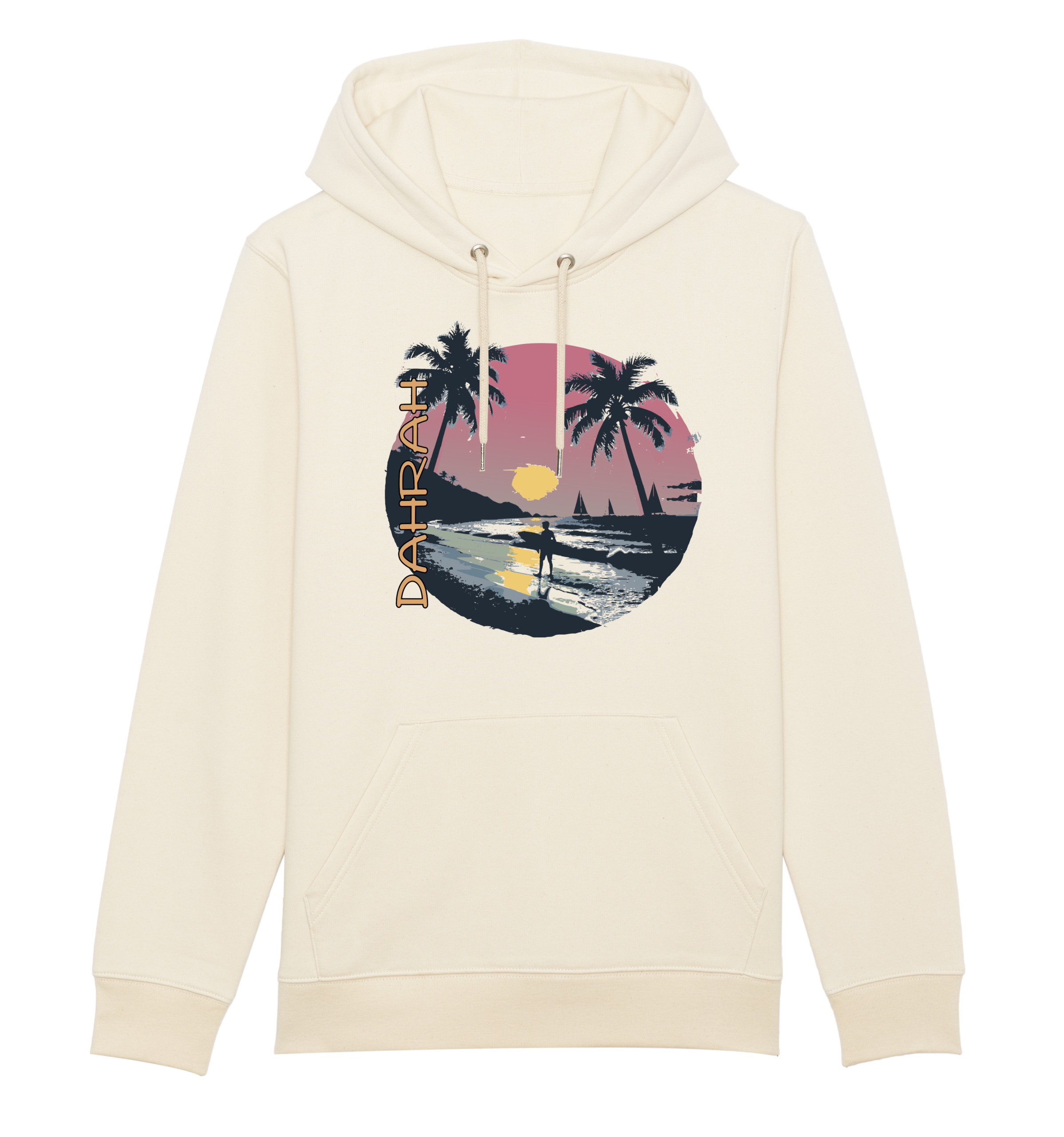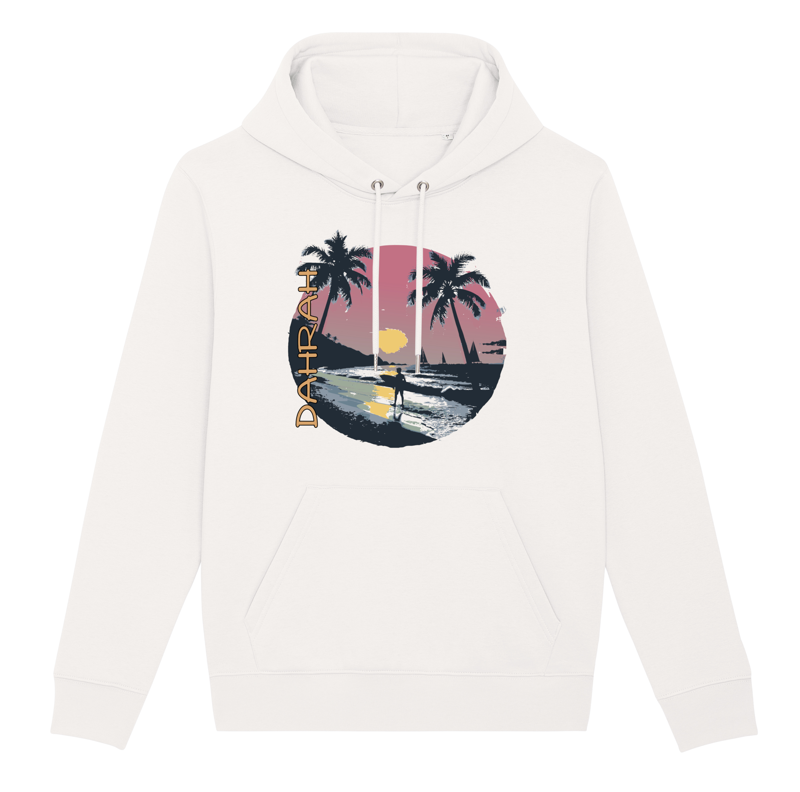 Surfing unisex hoodie with print of a surfing beach. Normal fit for mid-season.