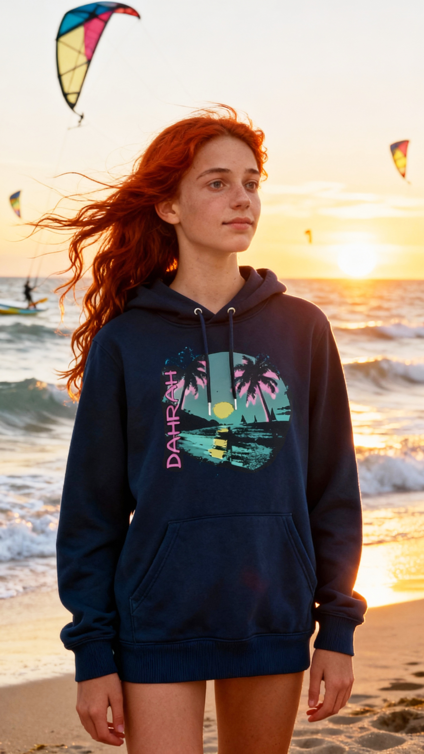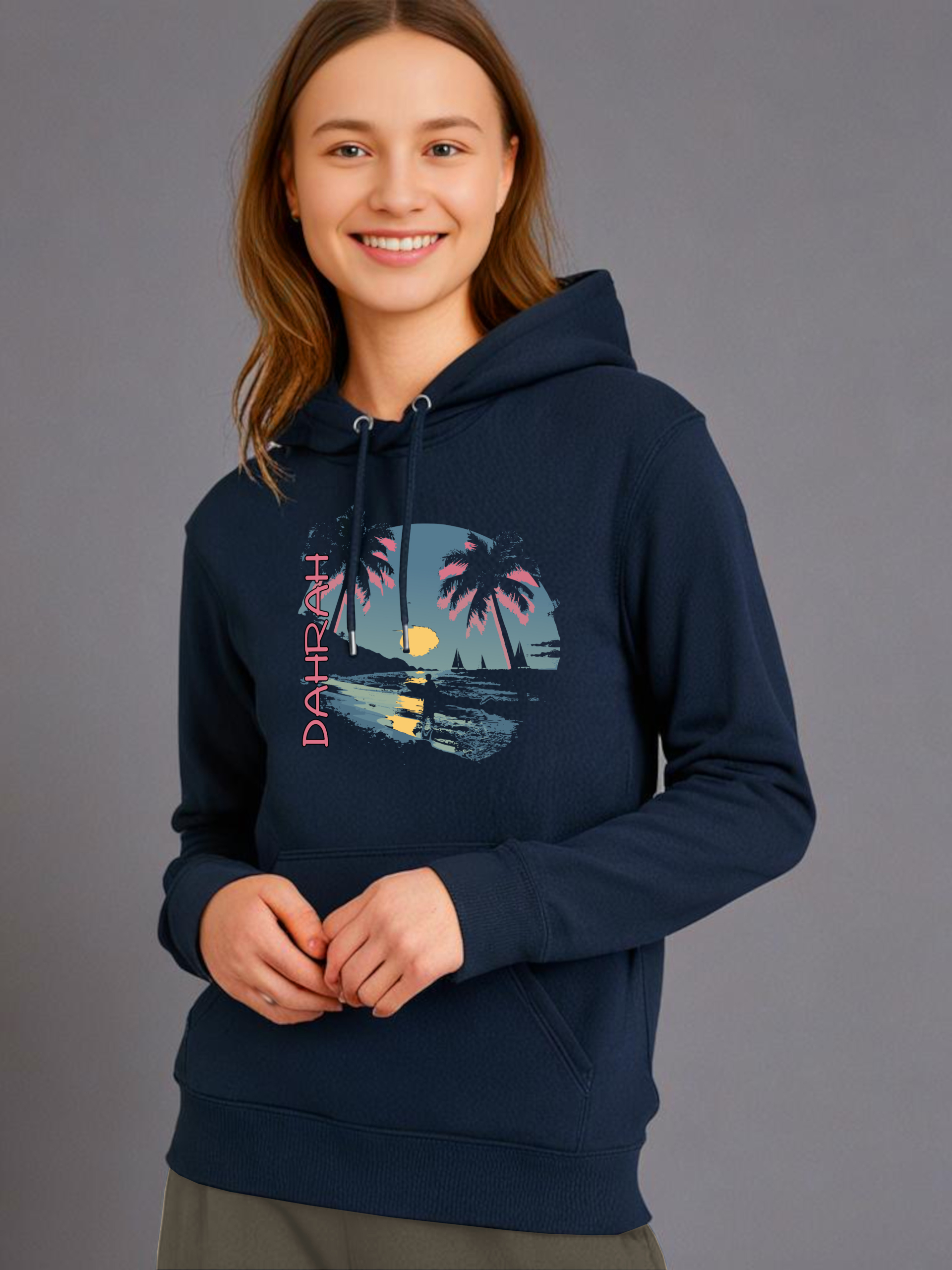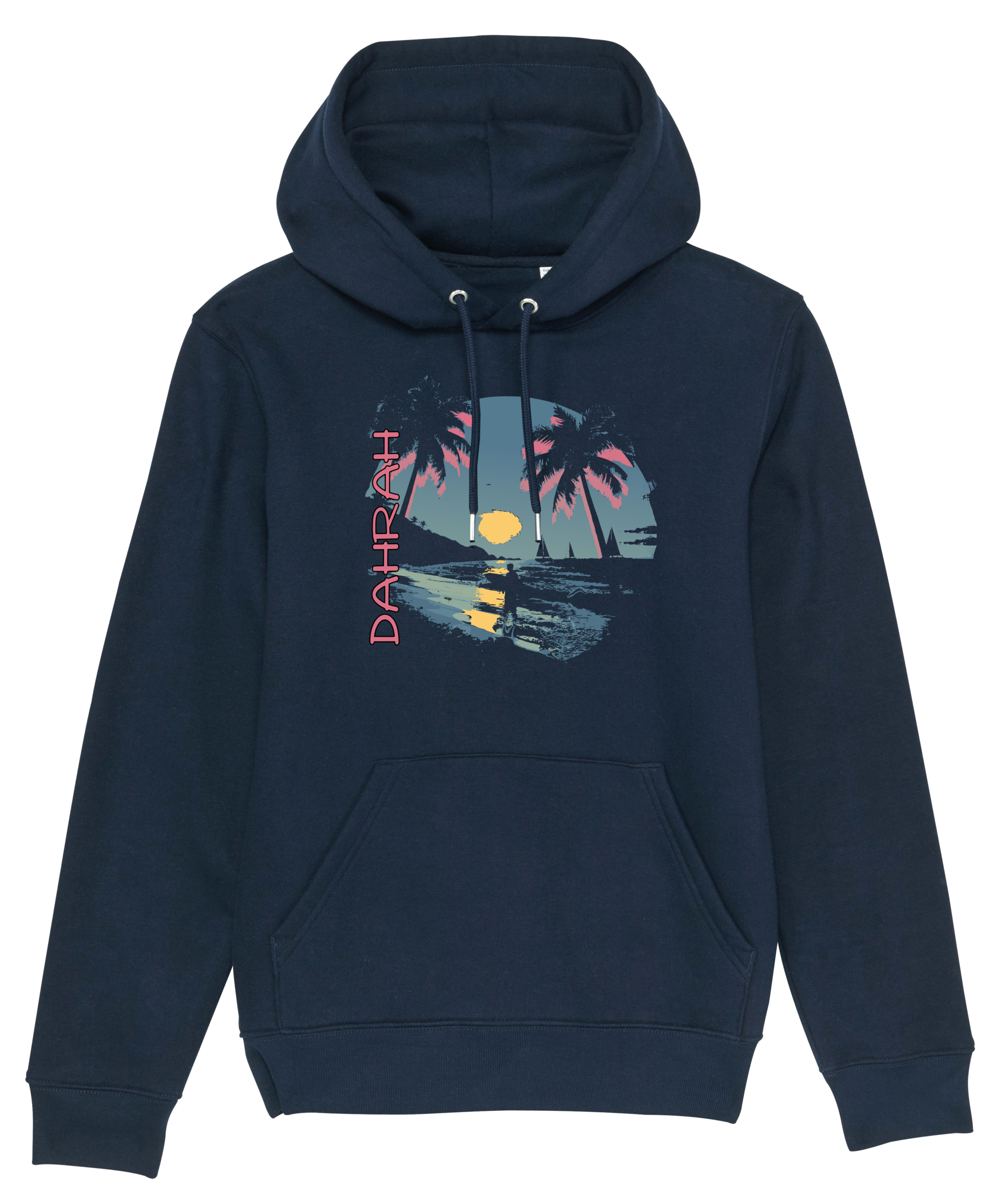 Surfing unisex hoodie with print of a surfing beach. Normal fit for mid-season.
