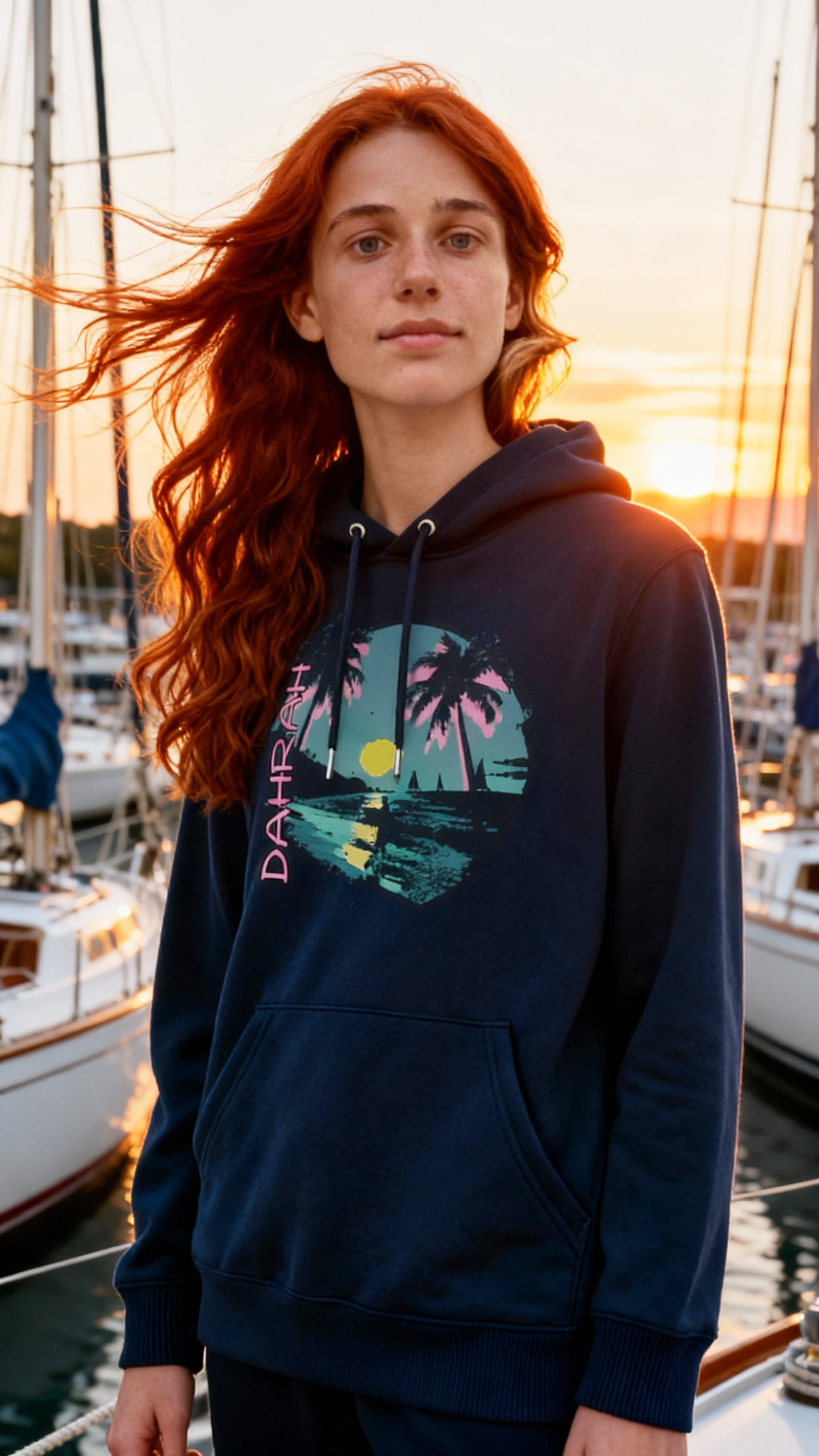 Surfing hoodie by DAHRAH, normal fit, for winter or mid-season. 80% organic cotton, 20% recycled polyester, 350 GSM (gram per square meter). Vegan and OEKO-TEK certified. Click here for size advise: take a hoodie that you own which fits you well and compare the dimensions.