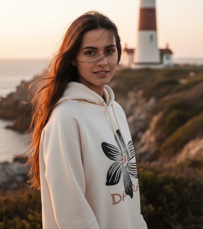 Surfing unisex hoodie by DAHRAH with side pockets and raglan sleeve. Normal fit, for winter or mid-season. 85% organic cotton, 15% recycled polyester, 300 GSM (gram per square meter). Vegan and OEKO-TEK certified. Click here for size advise: take a hoodie that you own which fits you well and compare the dimensions.