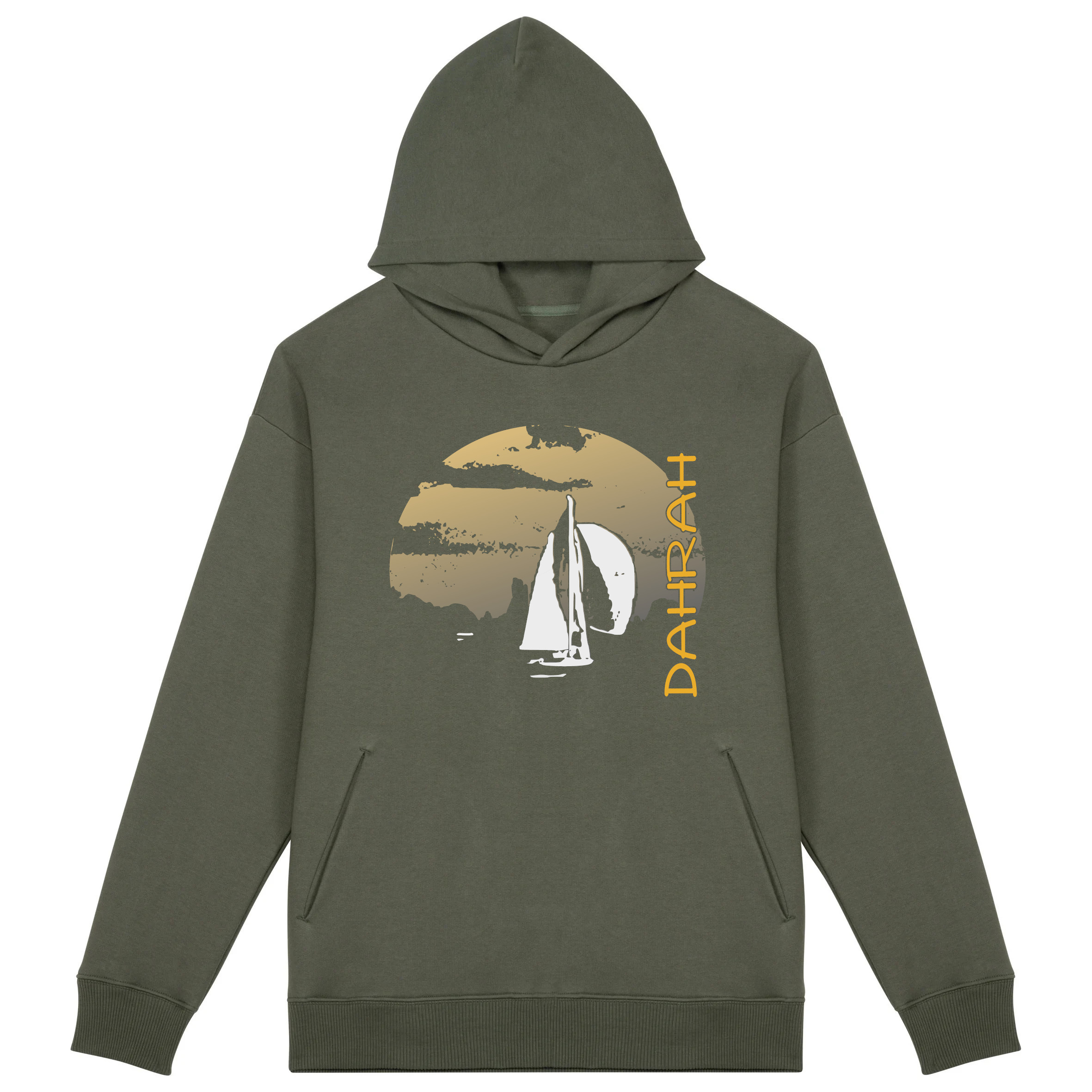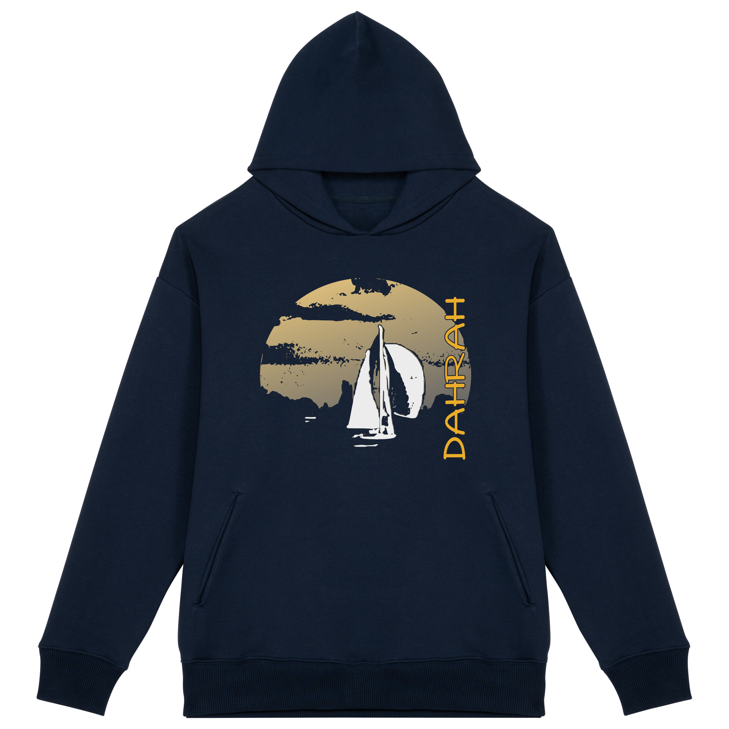 Unisex sailing hoodie by DAHRAH with side pockets. Oversized fit, for winter or mid-season. 85% organic cotton, 15% recycled polyester, 300 GSM (gram per square meter). Vegan and OEKO-TEK certified. Click here for size advise: take a hoodie that you own which fits you well and compare the dimensions.