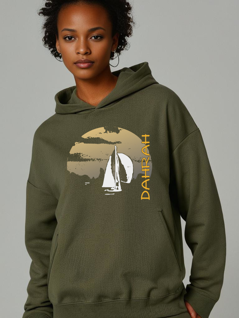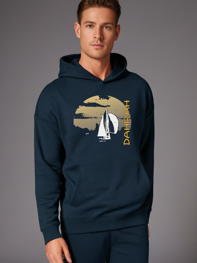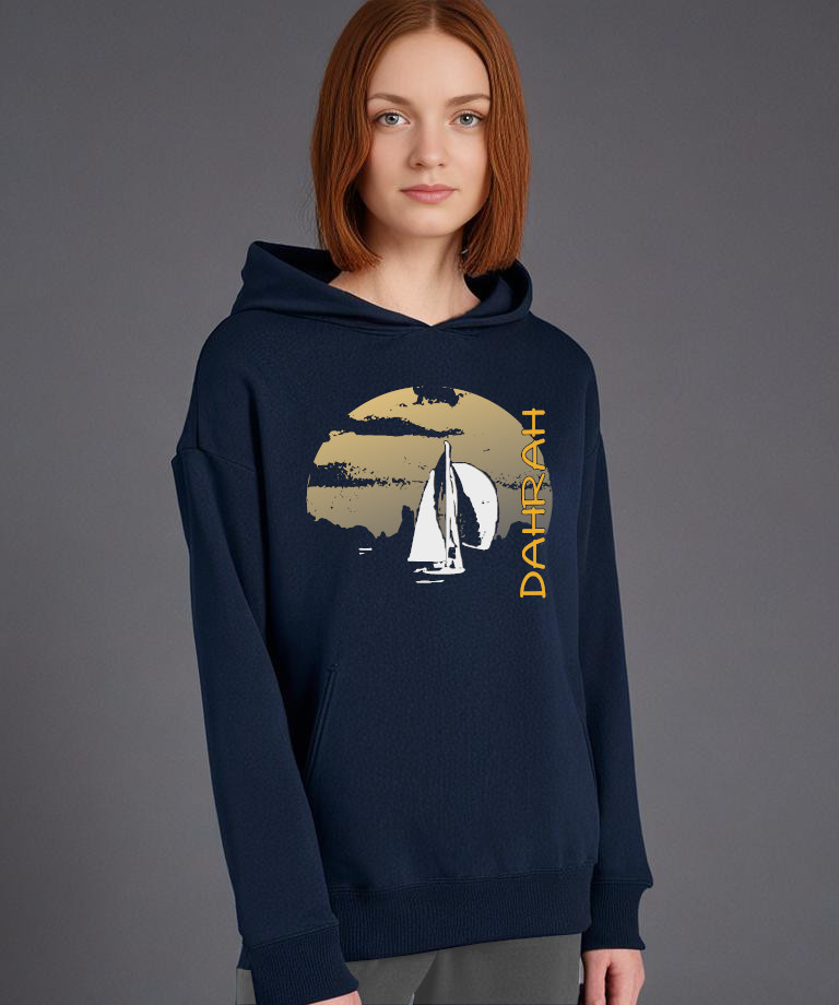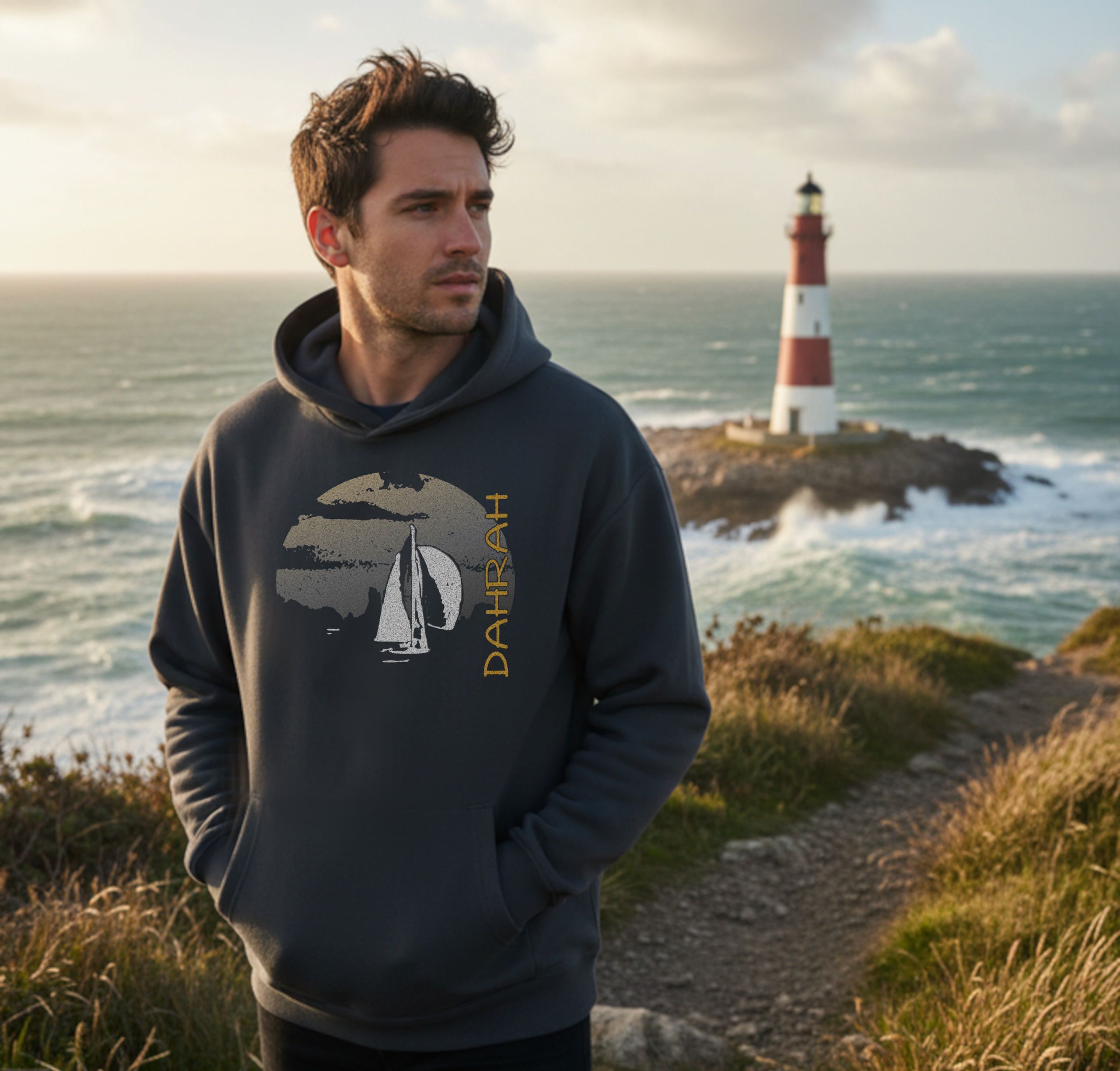 Unisex sailing hoodie with print of a sailboat. Oversized fit with side pockets, for winter or mid-season.